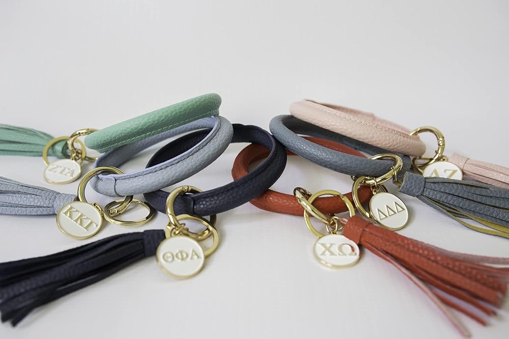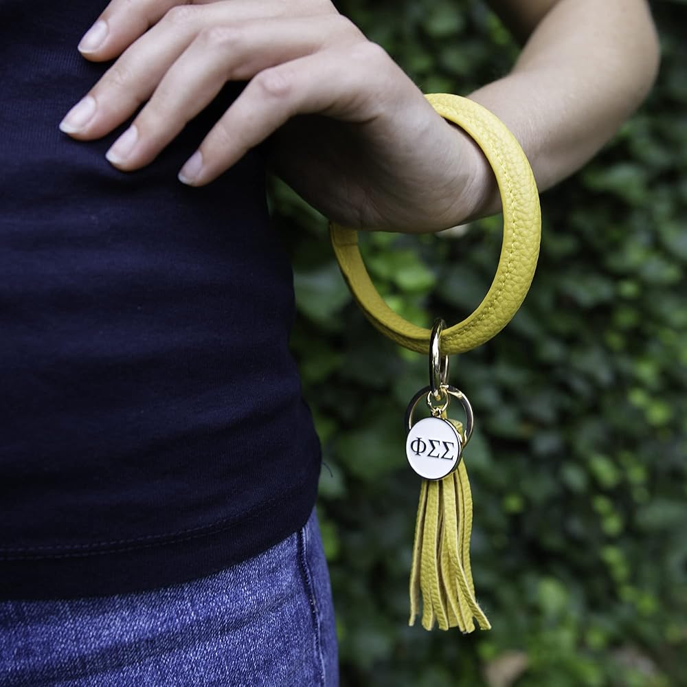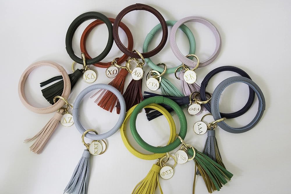 HIGH QUALITY MATERIALS - We ensure that our Bracelet Keychains are high quality by producing them with premium quality vegan leather wrapped bangle and a premium vegan leather tassel. The vibrant sorority specific color of the vegan leather pops against the white pendant that features your sorority's letters engraved in gold. Perfect as a keyring bracelet, or attached to your bag as a fun and flirty accessory!