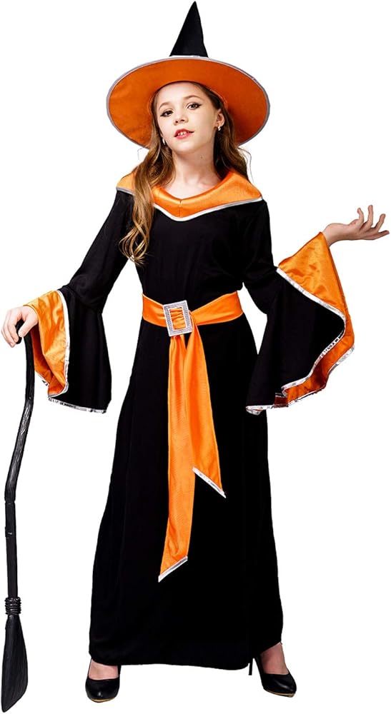 Girl's the Glamour Witch Dress Halloween Costumes includes:Hat,Dress,Belt. different sizes for you select,Nice costumes for cosplay party. It is great outfits for Halloween day, Gothic party, Renaissance
