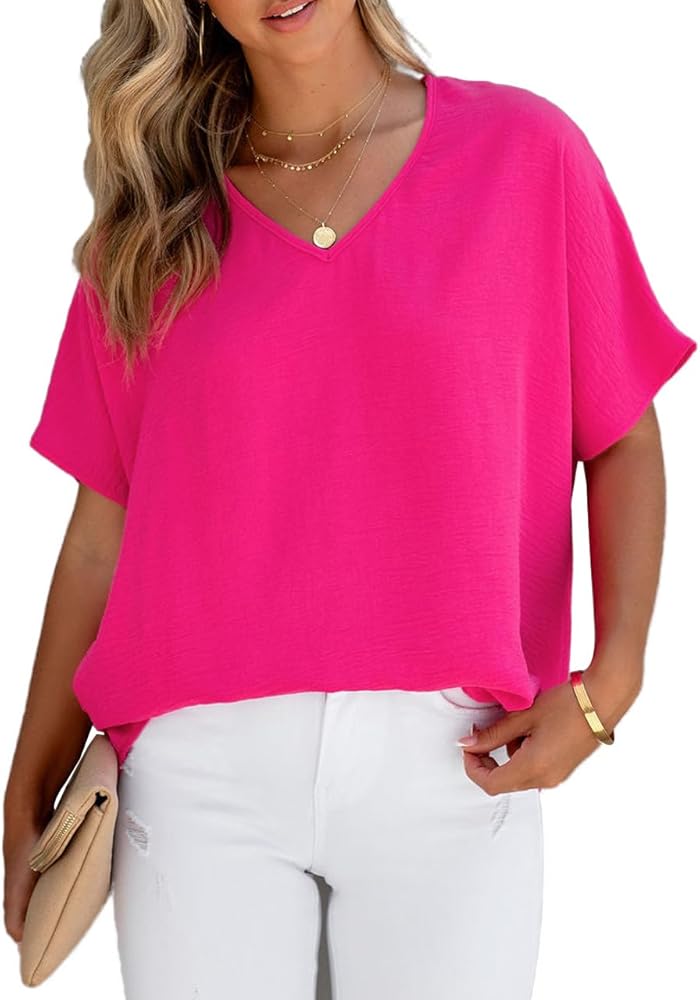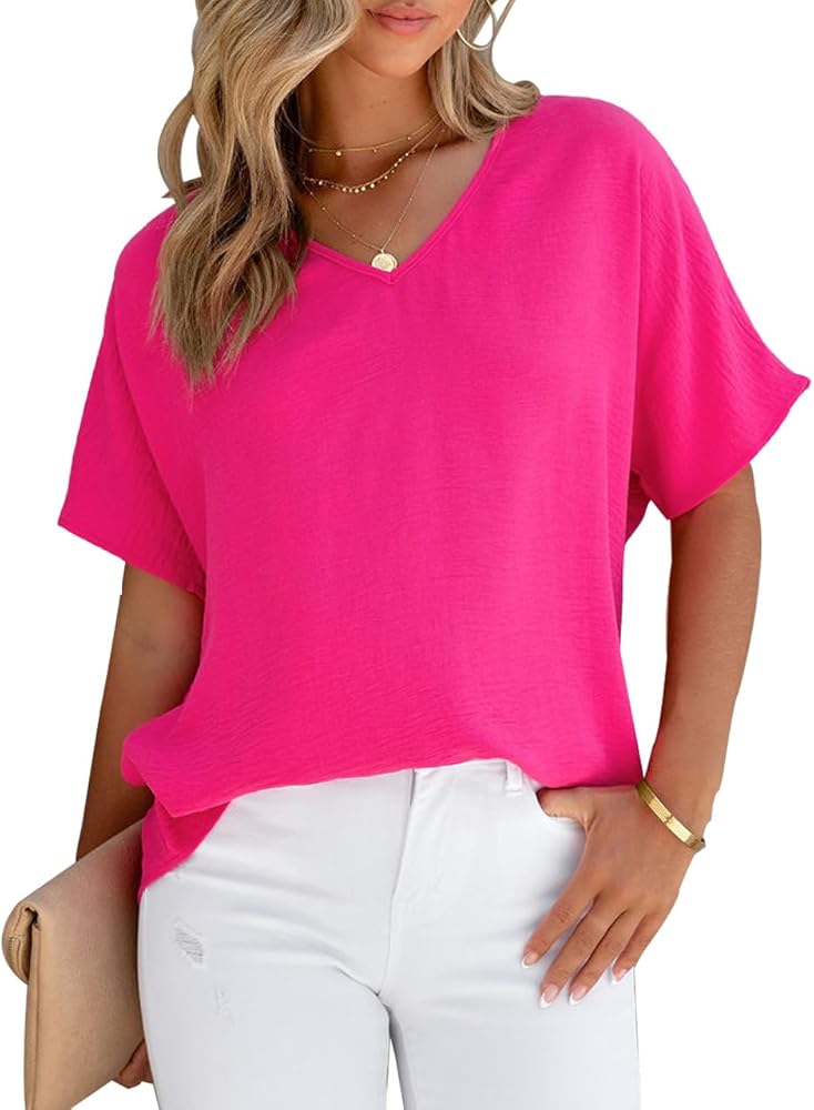 Allimy Women Summer Casual V Neck Textured Blouses Loose Short Sleeve Tops