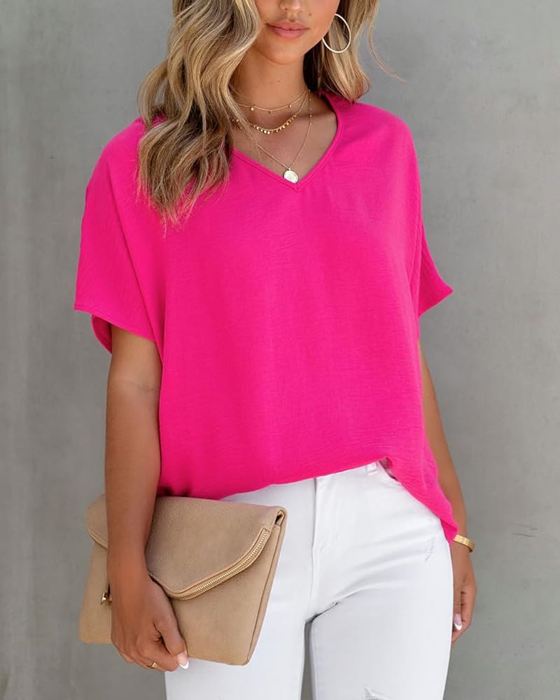 - V Neck, Rounded Hemline, Short Sleeve,Loose flowy
