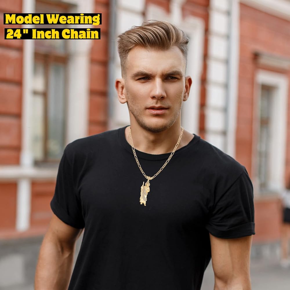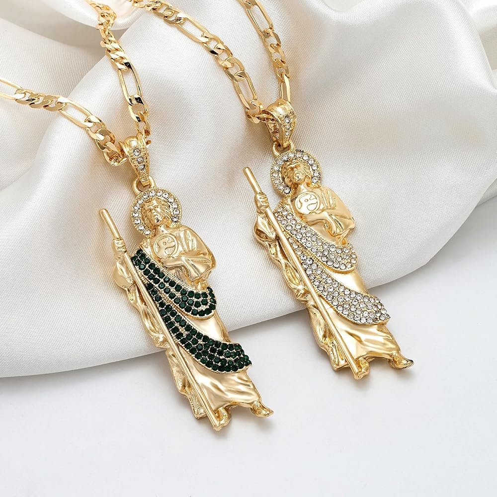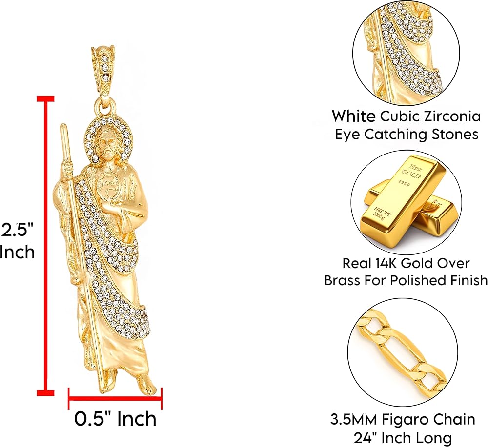 Luxe & Co. Jewelry Saint Jude XL Diamond 24" Necklace 14K Gold Plated Figaro - San Judas Tadeo Medalla 14K Oro Laminado- San Judas Tadeo Cadena