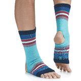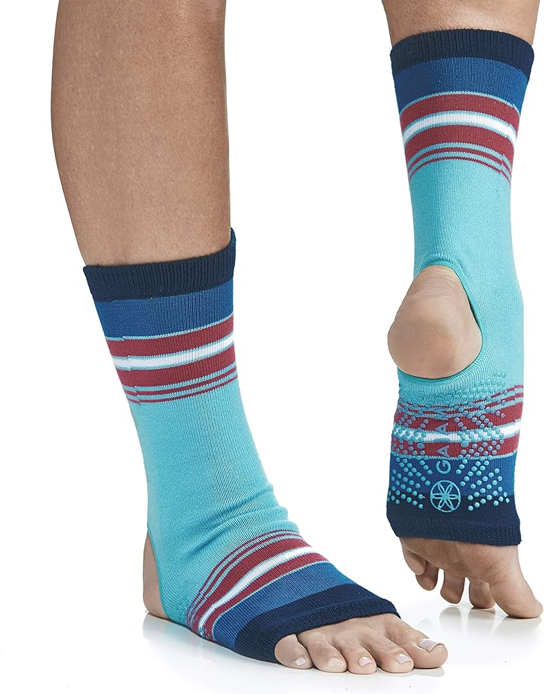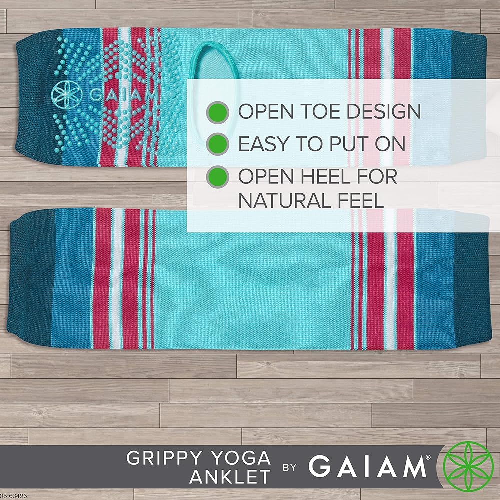 Introducing the Gaiam Yoga Sock Anklet - all the same benefits of the grippy yoga sock, but without the toe restriction and bulky sock feel. Anklets feature an open toe design that allows you to easily slip into the sock with full openings on both ends, and a slit in the middle for the heel. A grippy silicone dot pattern on the bottom helps to aid in increased stability, balance and grip during poses and stretches. Multi-purpose socks are a must-have yoga accessory for your practice (yoga, barre, Pilates, dance and any exercise or workout), but also are extremely helpful around the house when doing household chores or lounging. Dimensions (11. 75"L x 3. 75"W - Small/Medium (One Size Fits Most) - Women's Shoe 5-10 / Men's Shoe 4-9 | Machine Wash; Dry Flat).