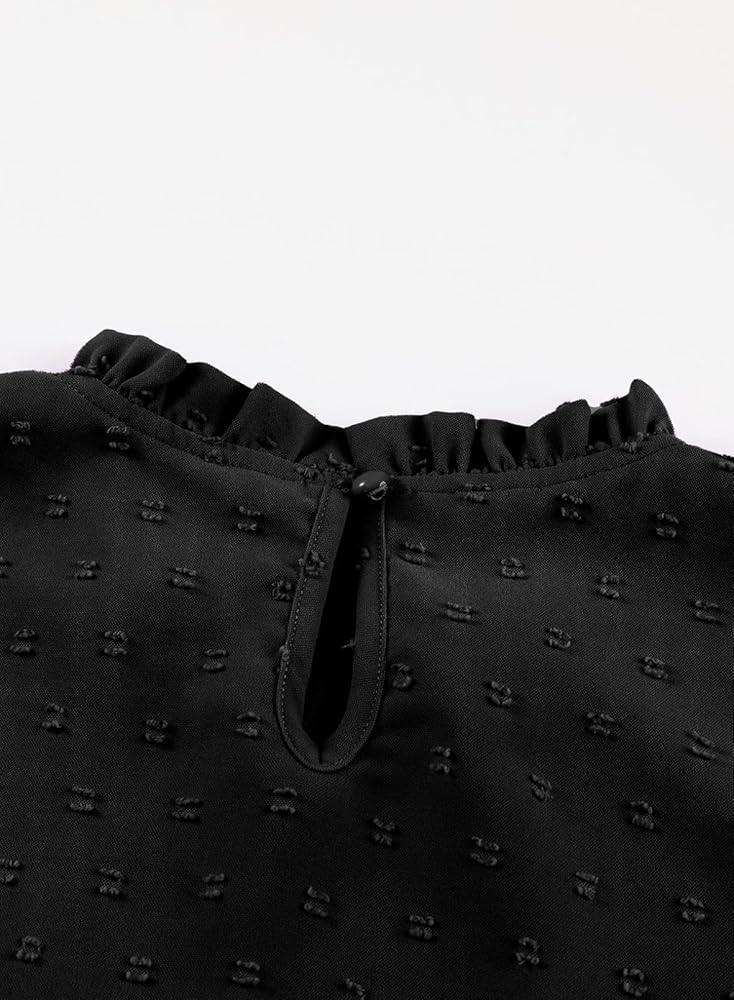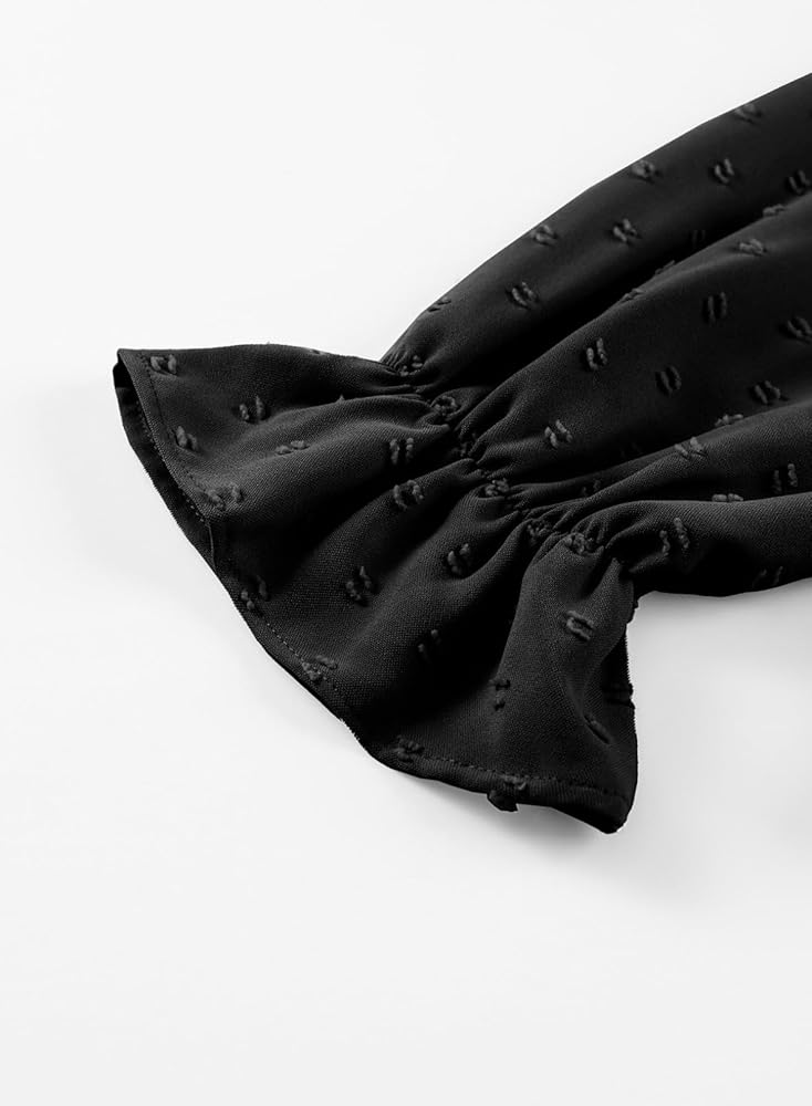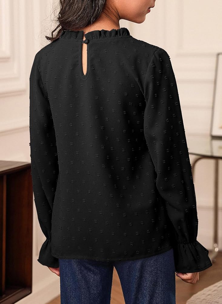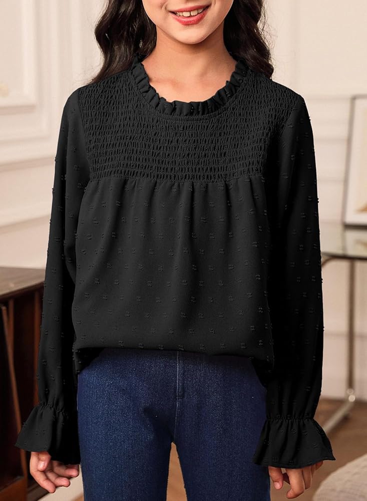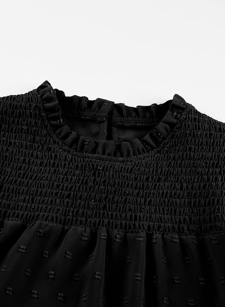 FEATURE: Basic Solid Color, Puff Long Sleeve, Ruffle Crew Neck, Front Elastic Pleated Smocked Bust, Polked Swiss Dot Detailing, Back Keyhole, Loose Fit Girl Outfit.