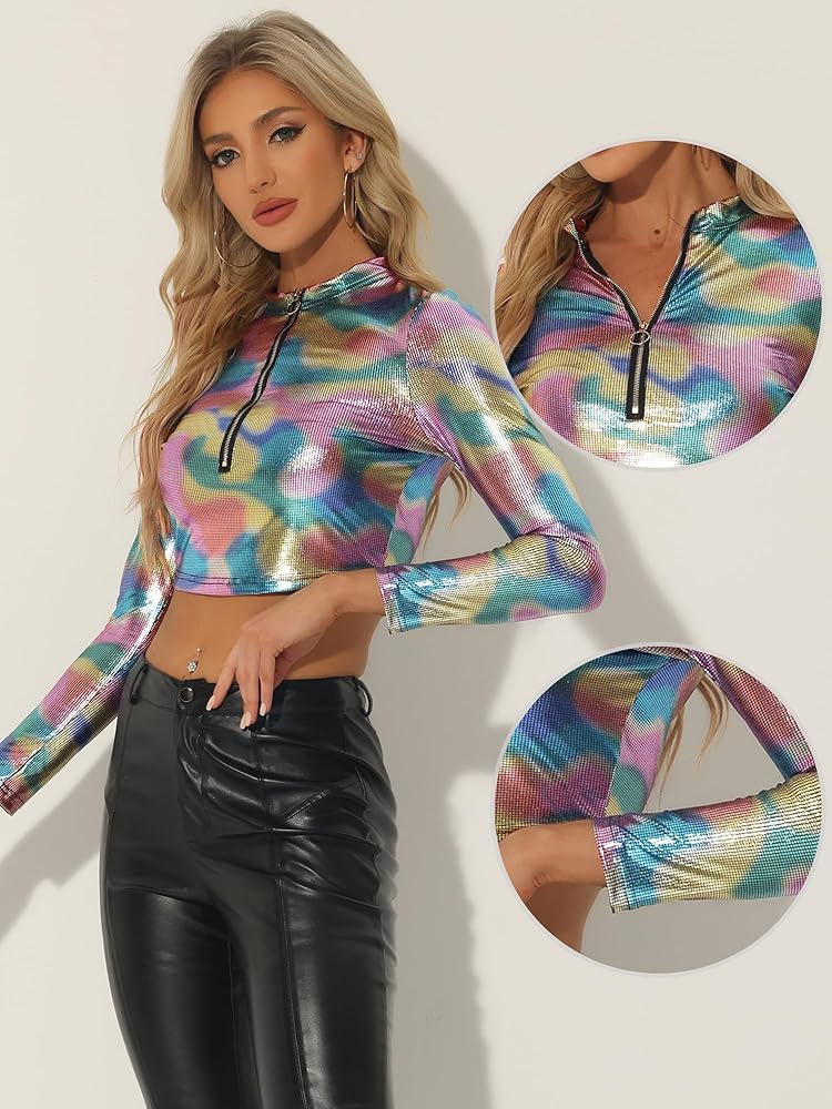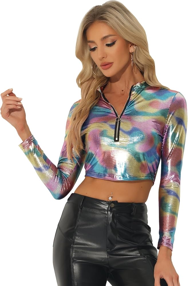 Allegra K Metallic Crop Top for Women's Halloween Mock Neck Long Sleeve Zip Up Party Shiny Tops