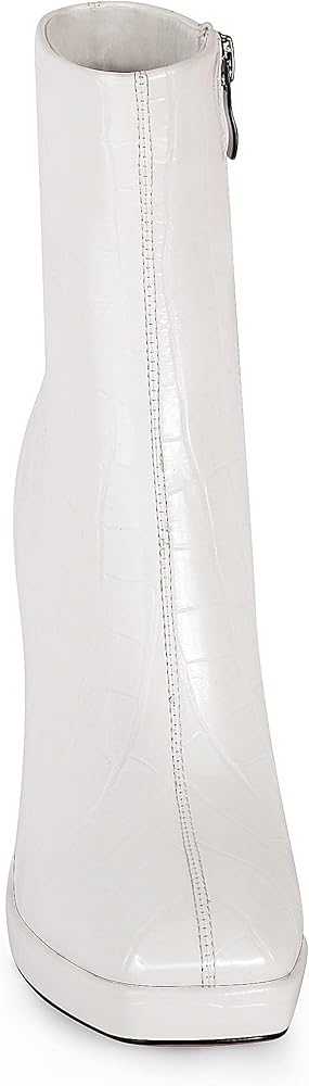 Ankle boots in faux leather with covered block heels, squarel toes, and visible seams front and back. Concealed zipper at inner side and a low platform.
