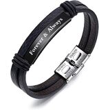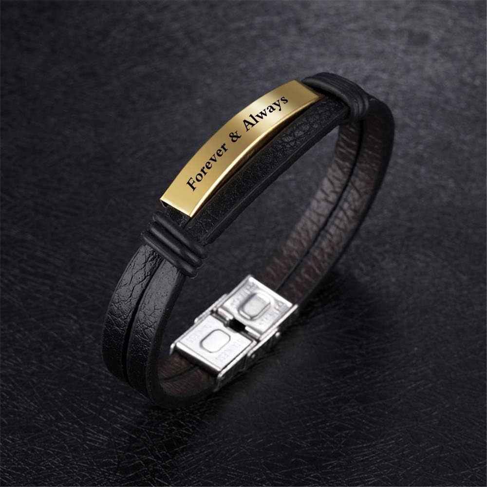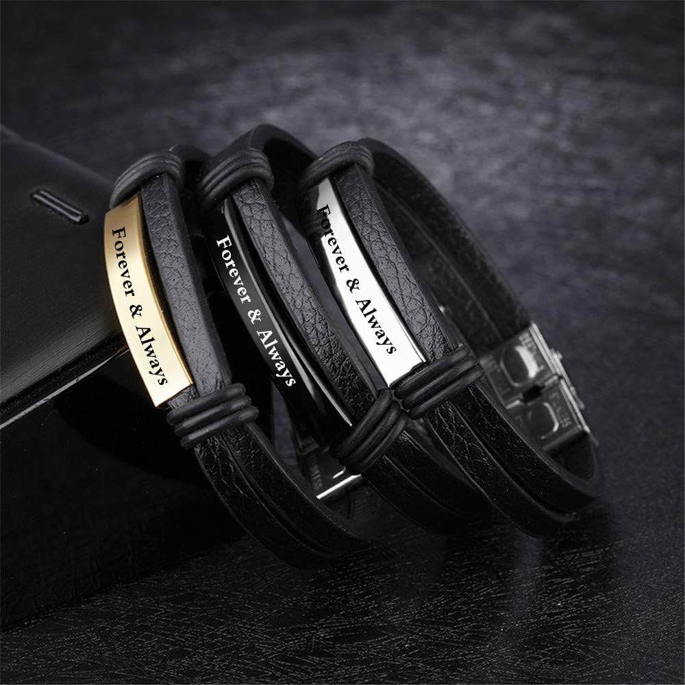 Personalized Black Leather Bracelet for Men Engraved 7.6" Adjustable Mens Bracelets Custom Name ID Bracelet for Men Dad Father Boyfriend Brother