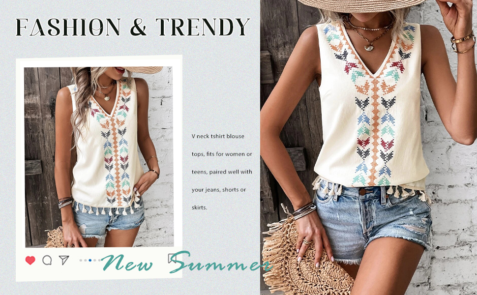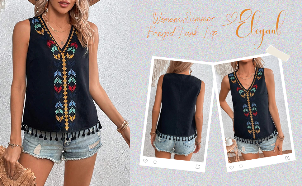 Perbai Womens Summer Fringed Tank Top V Neck Boho Mexican Embroidered Sleeveless Shirt Blouse