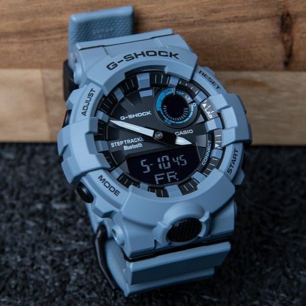 Get going with your active day with this G-Shock watch. A built-in 3-axis acceleration sensor begins counting steps the moment you start to walk. A step number level graph at 6 o'clock shows the current step number and the number 1 hour earlier, and a status indicator window in the upper right area of the dial displays the target achievement rate. Signal range up to 2 meters. The 15-hole band is designed to enable fine adjustments. Resin strap with adjustable buckle closure. Round face. Shock resistant. Dial features backlight, multi-function alarm, hourly time signal, and flash alert. Features 1/1000 second stopwatch and countdown timer. Water resistant up to 20 ATM/200 meters. Presentation box included.