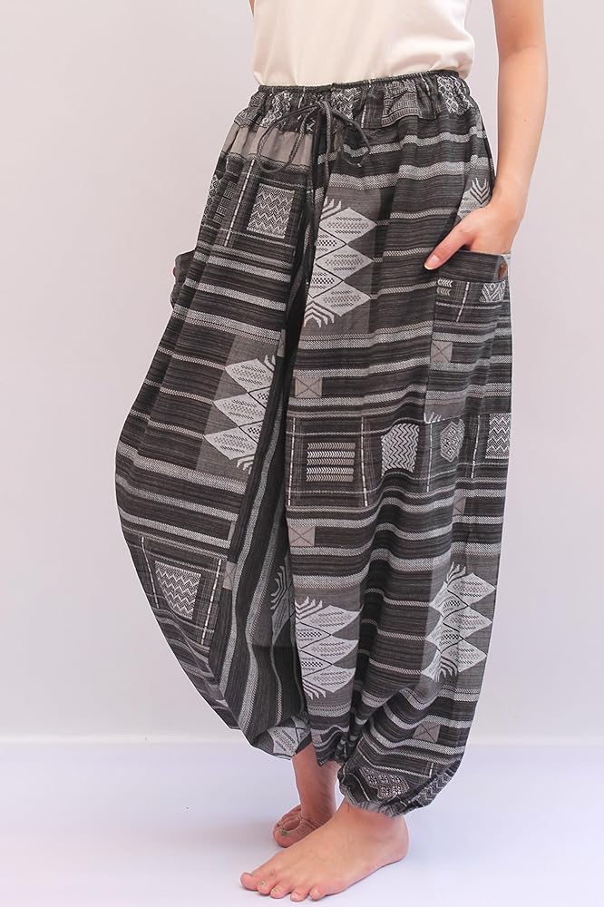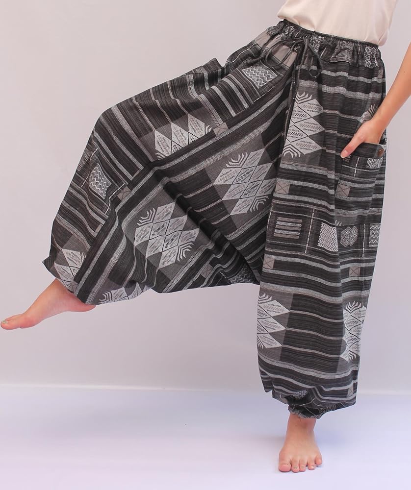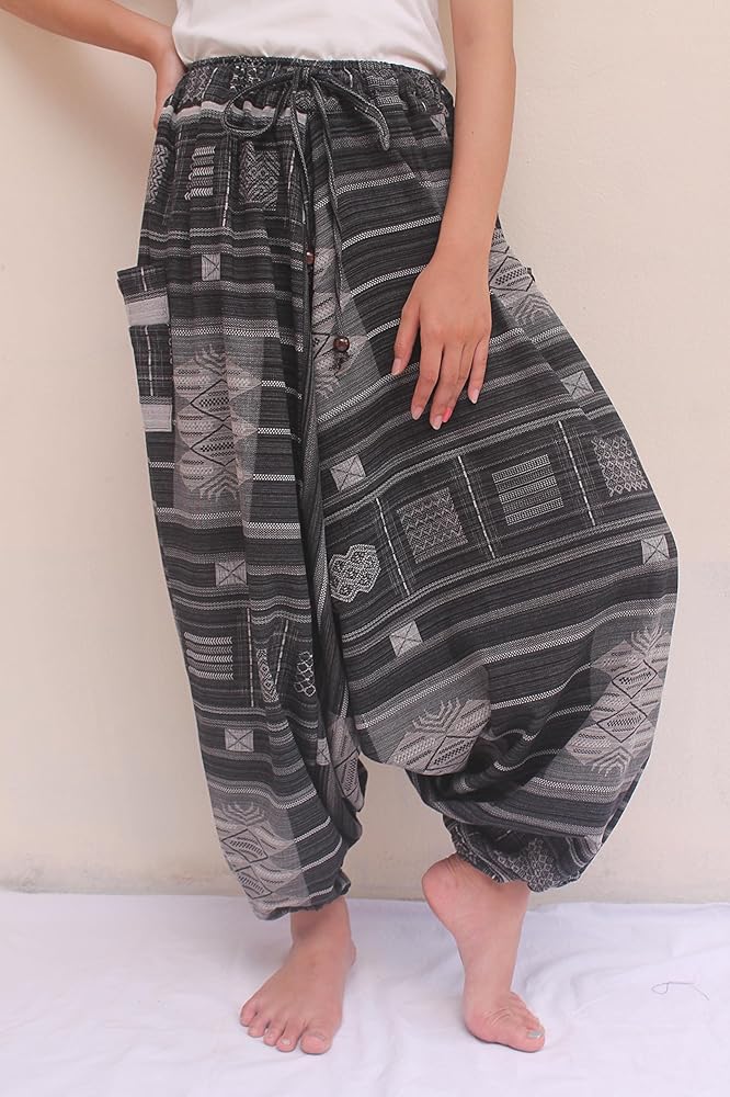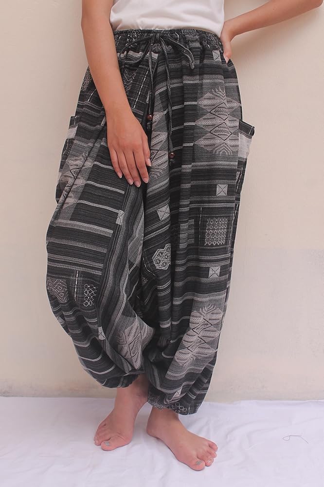 The Softest Most Comfortable Authentic Thai Harem Pants Around! Perfect for lazy days at home, doing yoga/pilates or dancing at the next great music festival. They're so comfortable Ethically Manufactured in Northern Thailand Our pants are made in Northern Thailand, by small teams of seamstresses. They're paid per pair they sew, allowing them the financial freedom to work for themselves and support their families & community. We pride ourselves on this. Elasticated Stretchy Waist for Maximum Comfort. There is a tight rope for straps. The end of the rope is decorated with wooden beads Gender Neutral The Harem Pants are great for Men & Women. Be warned, because these are so comfortable, your significant other will steal these from you! Measurement Size S-XL Elastic Waist for 26" - 42" Hips up free Length approx. 37" Size L-XXL Elastic Waist for 30" - 46" Hips up free Length approx 41" Vibrant Colors & Patterns The colors on these pants pop! You'll certainly stand out from the crowd in these unique pants. Garment Care HaremPants are made from the softest delicate Thai cotton, therefore hand washing is highly recommended to ensure their longevity. If hand washing is not your thing, it's best if you machine wash on gentle setting in cold water & hang dry.