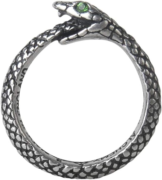 From ancient Greek philosophy, the Ouroboros, a snake-serpent eating its own tail, is the Gnostic symbol of eternity, rebirth and the unity of everything, representing both the sun and soul of the world. A pewter Ouroboros ring of a serpent swallowing its own tail, and with Swarovski crystal-set eyes.