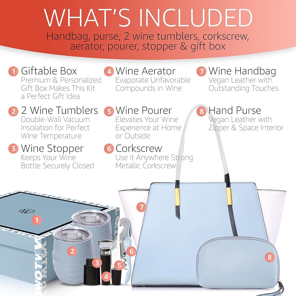 Package Includes: Wine Handbag, 2 Wine Tumblers, Wine Aerator, Wine Pourer, Hand Purse, Wine Stopper, Corkscrew and a Premium Giftable Box.