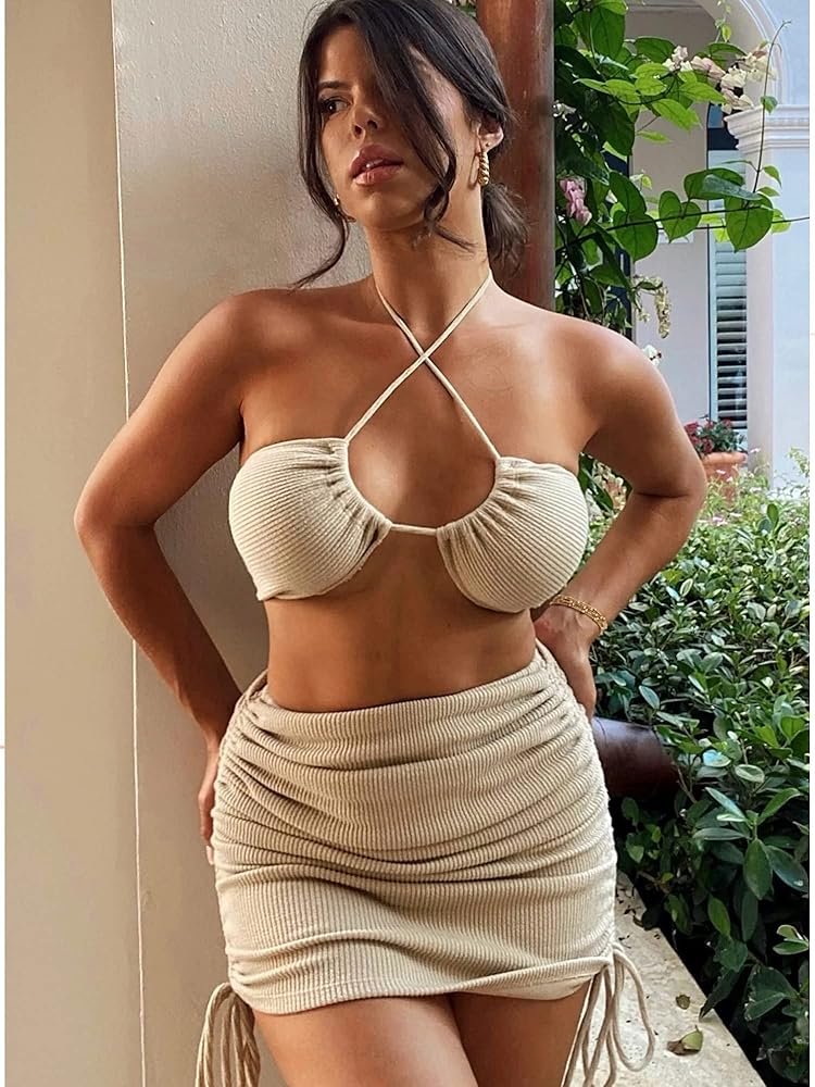 - حياكة مضلعة، طقم مكون من قطعتين، حمالة صدر، كشكشة قابلة للتعديل، حاشية مرنة في الأعلى والأسفل، ربطة عنق ذاتية، تنورة عالية الخصر، كشكشة قابلة للتعديل، خصر مطاطي.