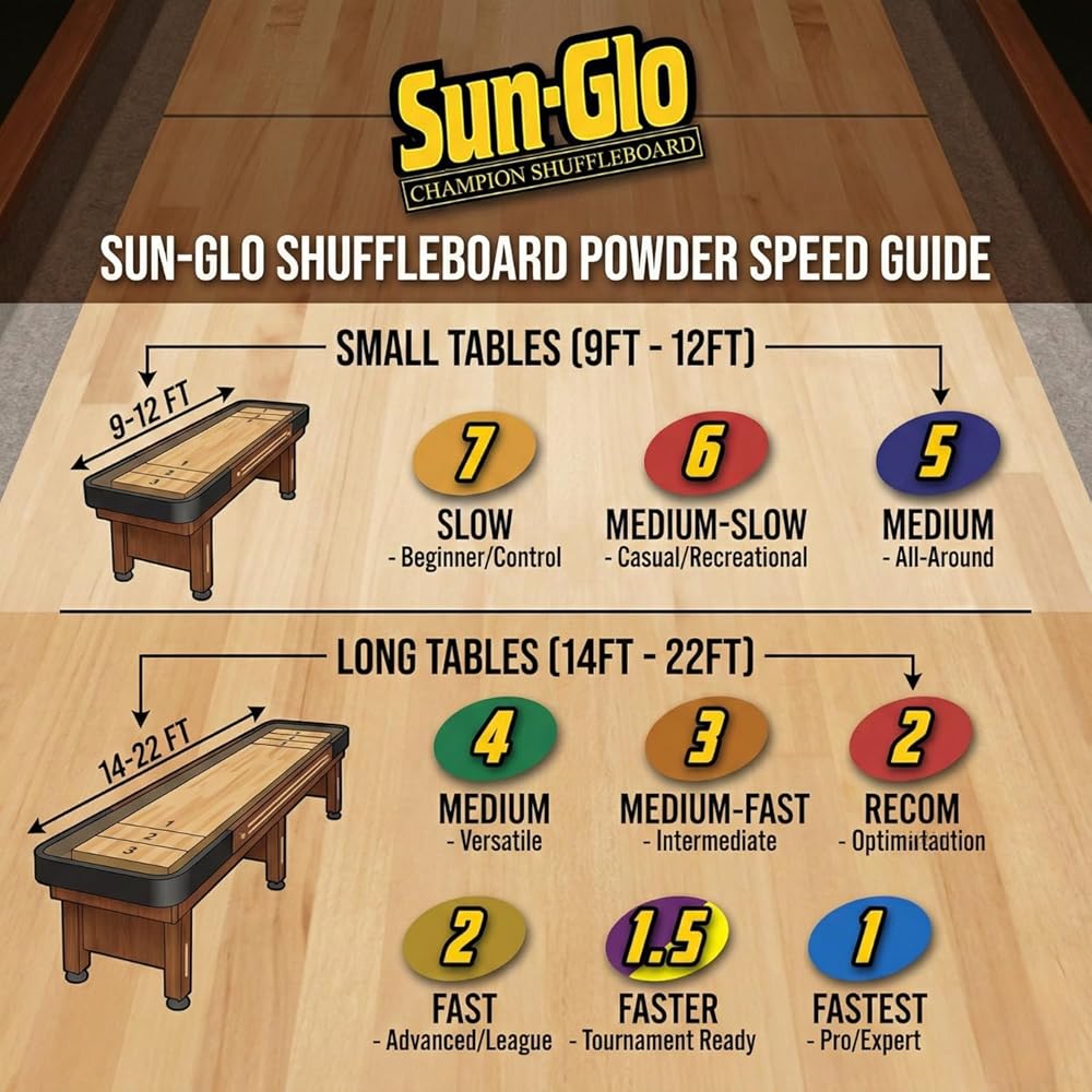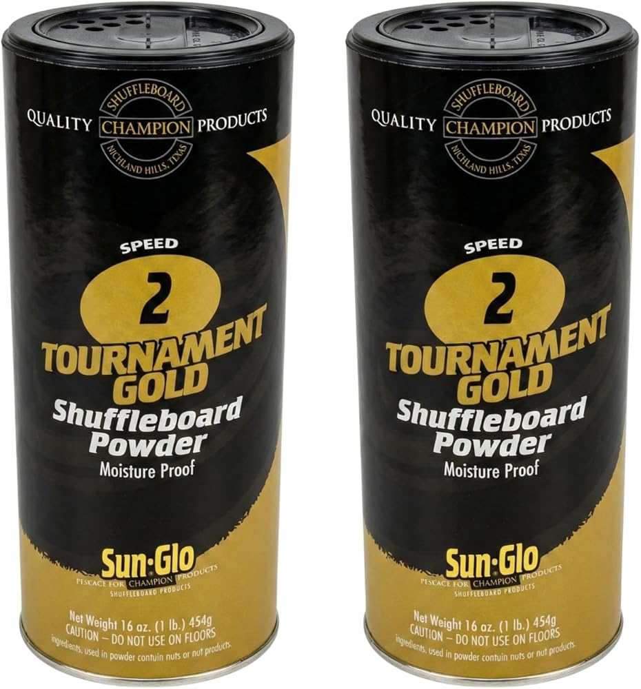 Bundle of one Sun-Glo Shuffleboard Sweep and a Twin Pack of Sun-Glo #2 Speed Shuffleboard Powder Wax . Our newest powder, formulated for the serious player. Used in most tournament play and preferred by professionals. The Sun-Glo Shuffleboard Sweep is made of solid wood and efficiently and effectively wipes up the used powder off the surface of your shuffleboard table leaving it clean for the next game. Use the Sun-Glo #1 Speed after using Sun-Glo Cleaner and Silicone spray to keep your game consistent and competitive, and your table clean.The Sun-Glo Corporation was founded in 1935 in Belleville, NJ and quickly became a leader in the shuffleboard accessories industry. Founder Ed Decepoli, Sr. chose the name Sun-Glo because the sun's reflection could be seen so clearly on tables after his polish was applied.In the fall of 2001 Sun-Glo was moved from New Jersey to Texas. Today, based upon its quality line and its reputation in the industry, the Sun-Glo market continues to expand with new products engineered especially for Champion Shuffleboard tables and formulation updates for some of the original line of products. Picking a powder is easy. Sun-Glo manufactures a variety of powders that allows you to create the kind of game you prefer. Fast, Super Fast, or a little slower with more control - it's up to you. All Sun-Glo powders are tested for consistency and accuracy. Since 1935, Sun-Glo has been a product you can trust. Designed and tested by professionals. So if you want to experience an extremely FAST game, a game with the elements of professional play or a slower, more family-friendly game, find the powder that works for your style of play. Or order one of each and test your skill!