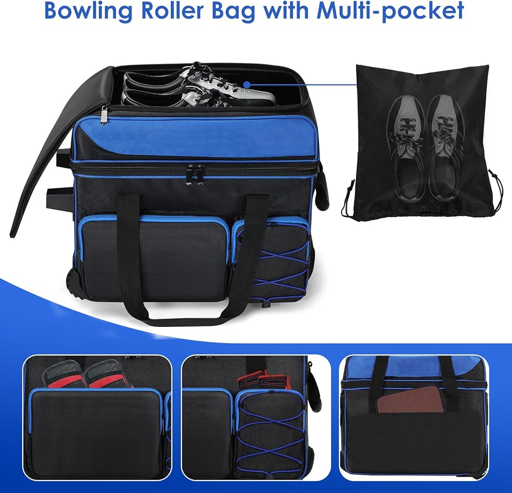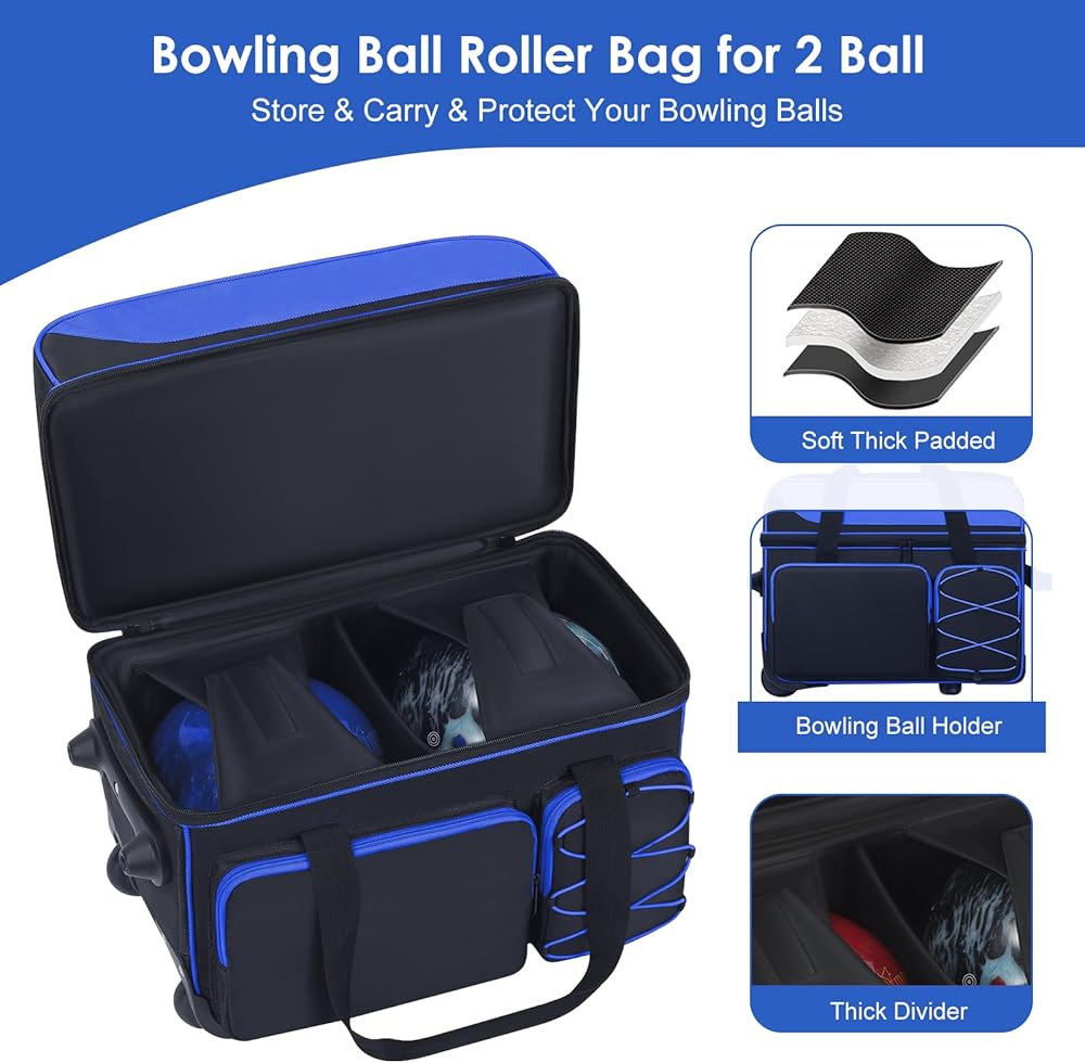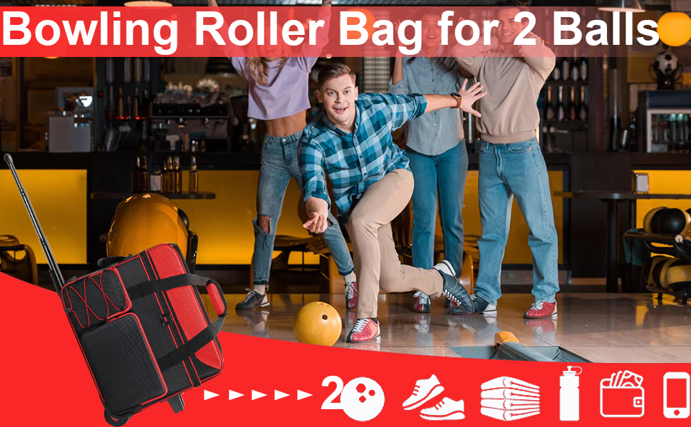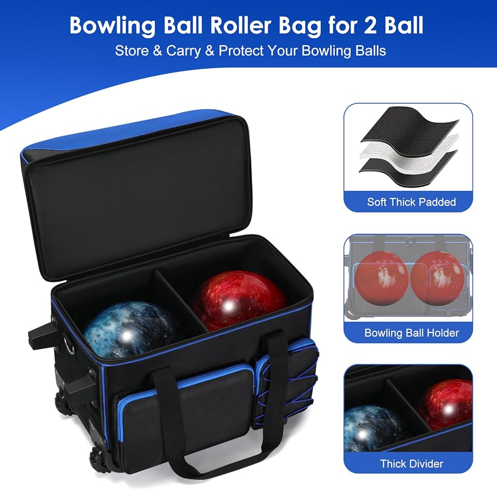 Double Roller Bowling Bag with Shoes Compartment, Large Capacity Bowling Ball Bag with Multi-Pockets for 2 Bowling Ball and Accessories, 2 Ball Bowling Bag with wheels & Retractable Handle