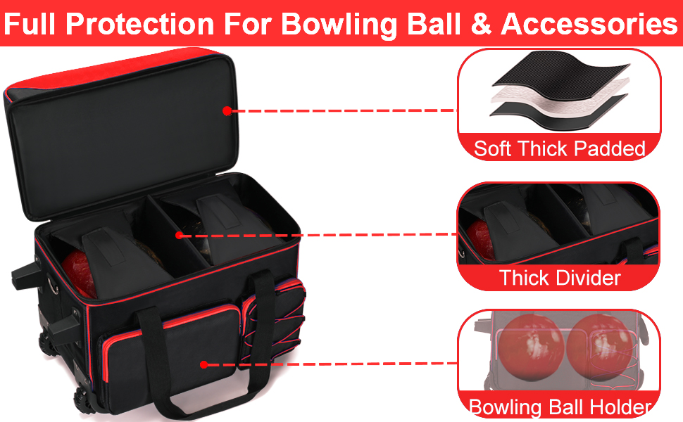 【Bowling Roller Bag with Large Wheels】Bowling roller bag is equipped with large wheels. The wheels of the bowling ball bag is large, smooth and sturdy, which makes bowling roller bag has better passability and also helps you to carry your bowling balls with less effort. So you can carry your bowling balls to anywhere easily with the Bowling Roller Bag with Large Wheels.
