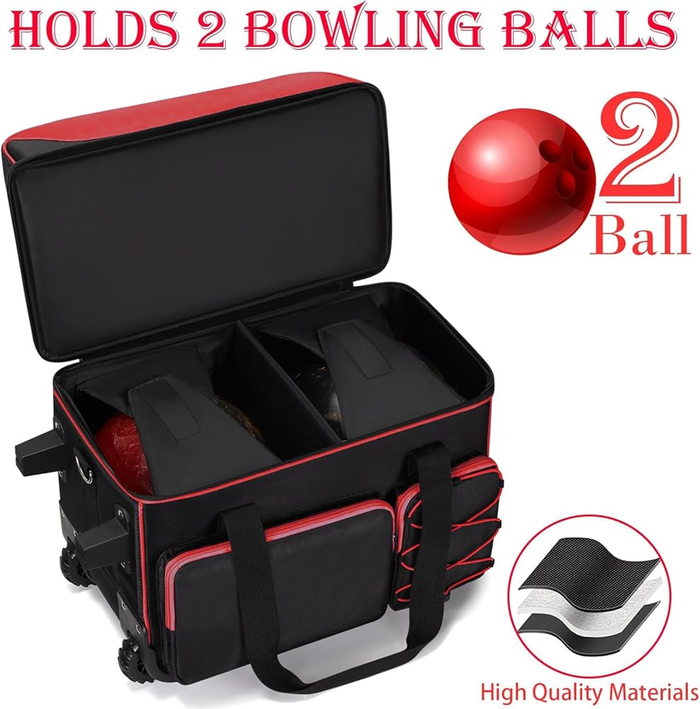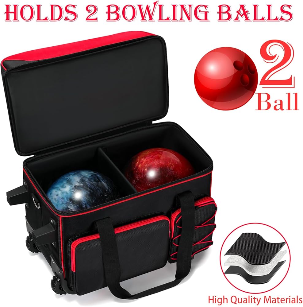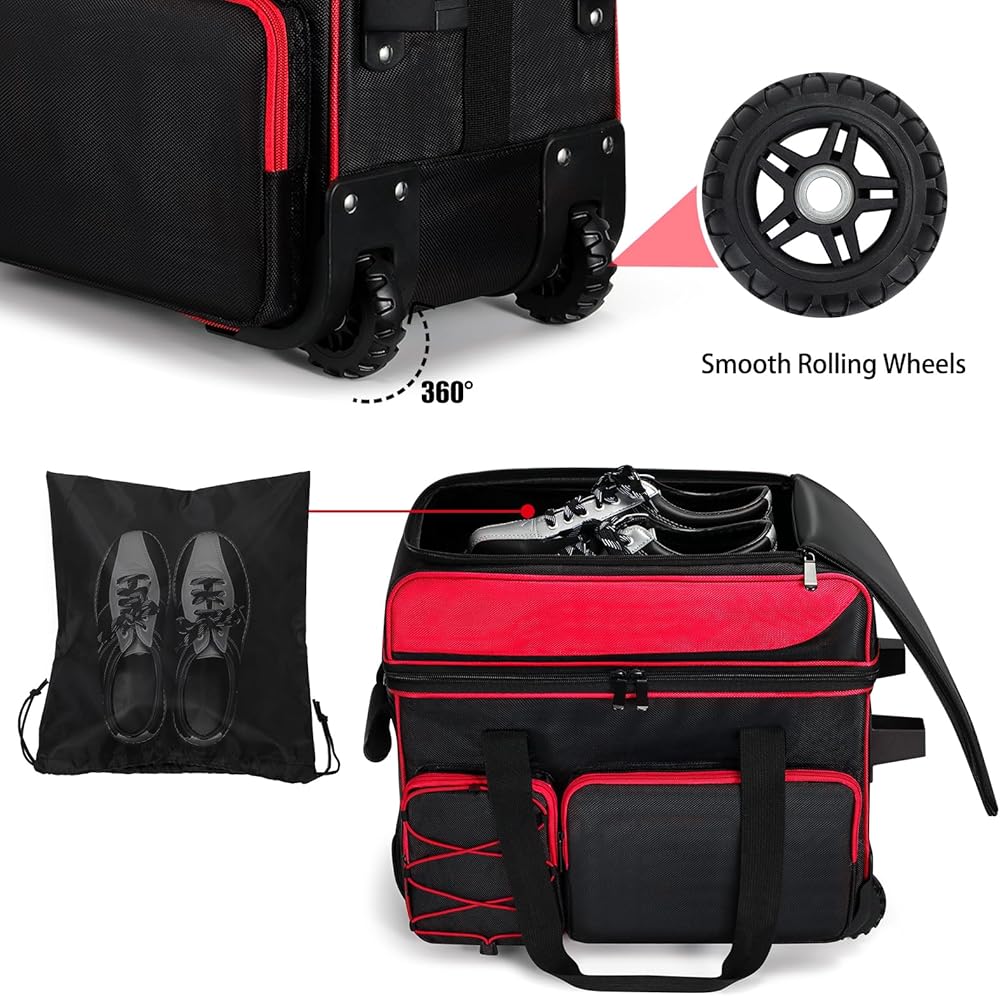 2 Ball Bowling Bag With Wheels, Large Capacity Double Bowling Ball Bag With Separate Shoe Compartment, Multi-Pockets Bowling Bag 2 Ball Roller With Extendable Retractable Handle To 42"
