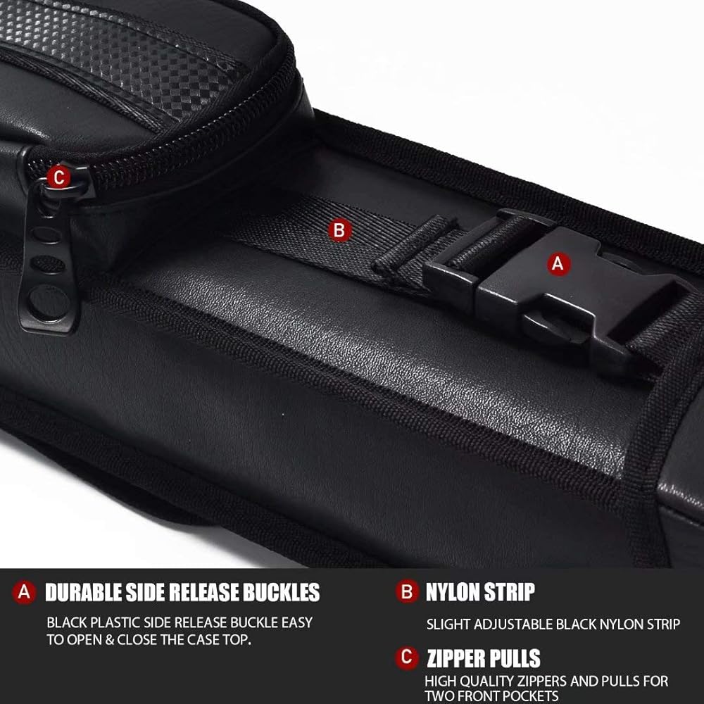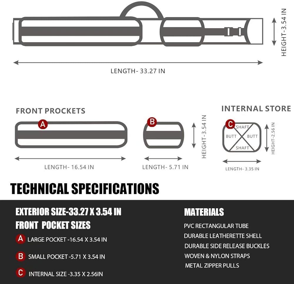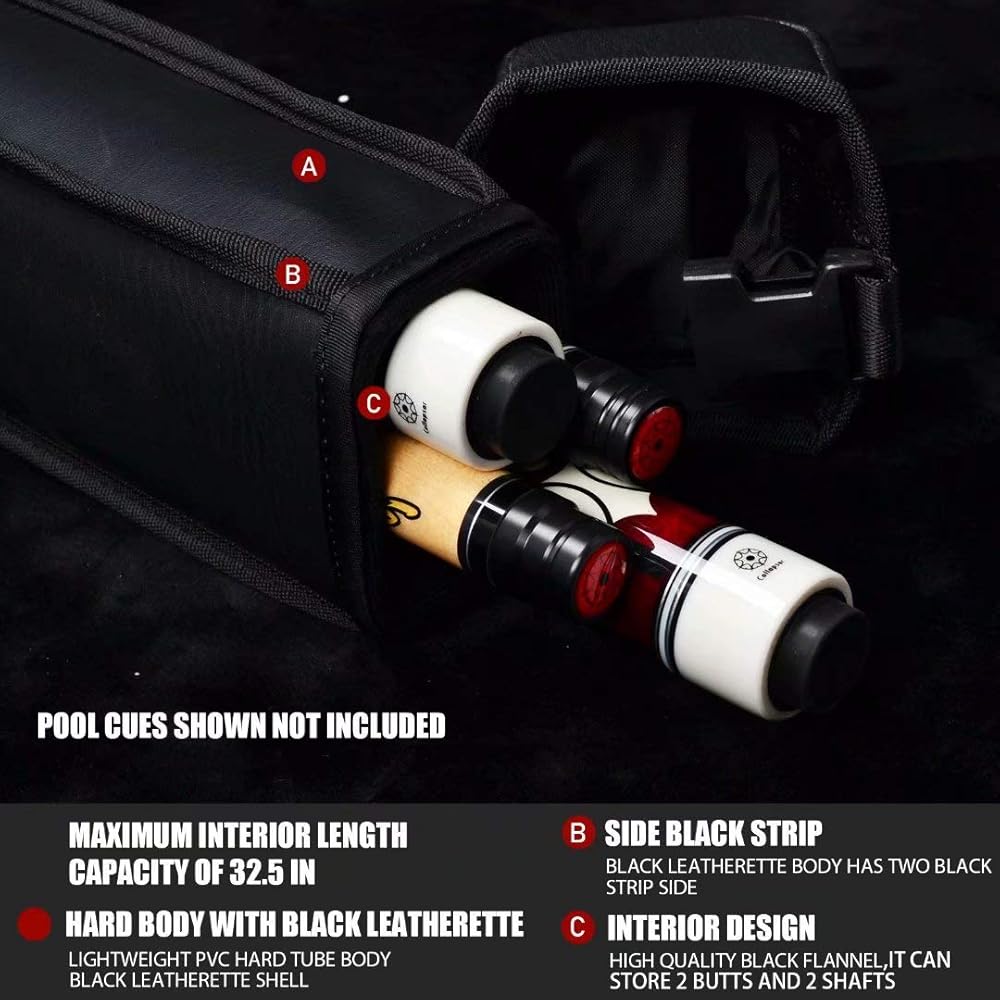 【CAPACITY】2X2 hard pool cue carrying case holds 2 butts and 2 shafts,with a maximum interior length capacity of 32.5 inch ,two spacious pockets for easy access to your essentials.