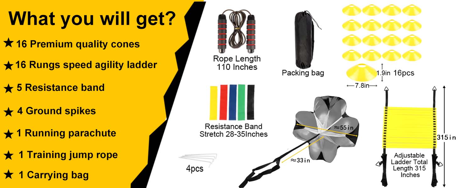 ⚽【Agility Training Equipment Kit】- 26ft Speed agility ladder is flexible and adjustable, It includes 16*heavy agility ladders, 16*sports disc cones, 1*resistance running parachute for speed training, 1*jump Rope, 5*resistance Bands, 4*ground stakes, and 1*portability bag.