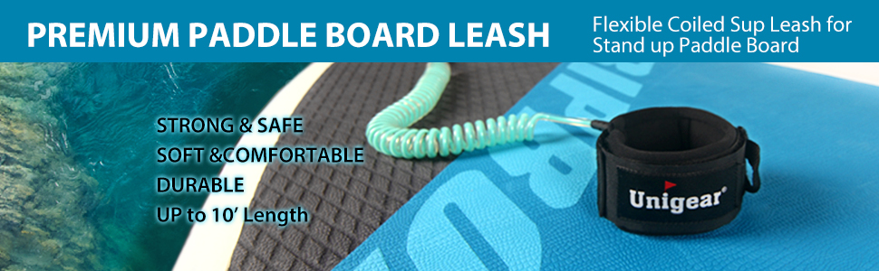 Our Unigear surf leash strong enough to handle the longest and heaviest of boards, but since it is designed for flatwater paddling it is lightweight and flexible. Its ankle cuff won't have you feeling like you broke out of prison. It will not snap and keeps you attached to your board no matter how many times you wipe out. The coiled leash and leash connection happily absorb wave impact, eliminates leash drag totally (so no risk of snagging submerged objects) and keeps your leash up on the back of your board and out of the water.