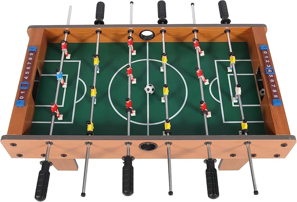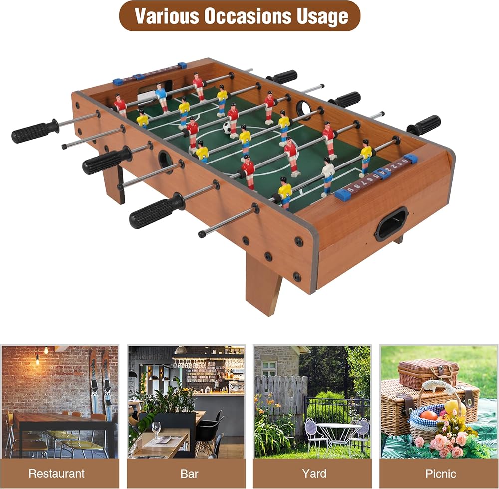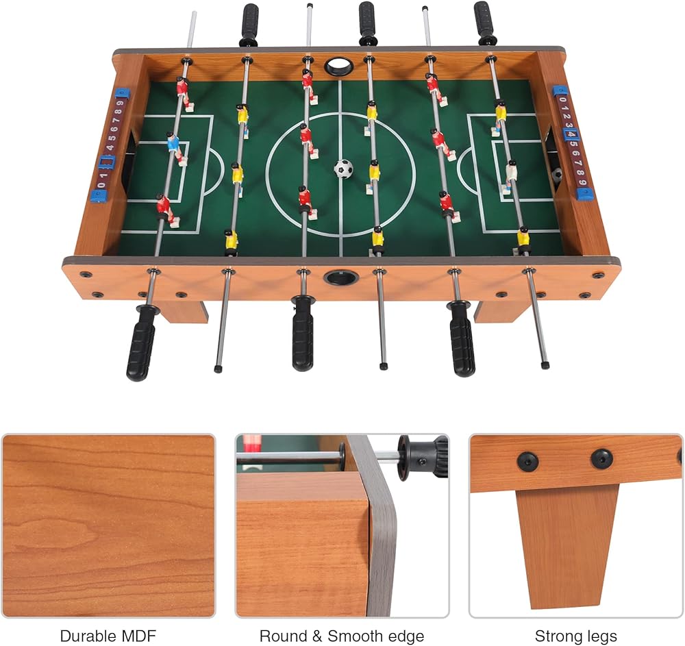 Real Football Game Experience:This multifunctional foosball tabletop kit is composed of 6 rotating poles and 18 players, equipped with 2 scoreboards, 2 goal frames and 2 mini football, which can bring you a challenging one-on-one team football game.