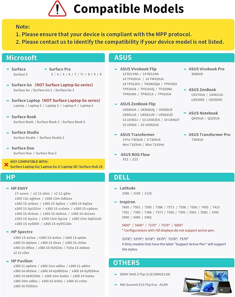 ❤【Wide Compatibility】NOT work for Surface Laptop Go which is a different serie from Surface Laptop and Surface Go! Contat us via [email protected] with the model if you are not sure about the compatibility. M1 supports up to MPP1.15 protocol, compatible with most Microsoft surfaces and some models from HP, ASUS, DELL, Acer, SONY and ViewSonic. [Surface Model List] ✔Surface Pro 3/Pro 4/Pro(5th Gen)/Pro 6/Pro 7/Pro 7+/Pro 8/Pro X, ✔Surface Book/Bk 2/Bk 3, ✔Surface Laptop/Laptop 2/Laptop 3/Laptop 4/Laptop Studio, ✔Surface 3, ✔Surface Go/Go 2/Go 3, ✔Surface Studio/Studio 2.
