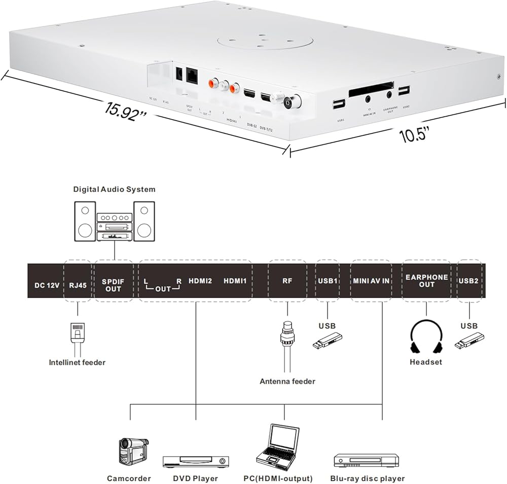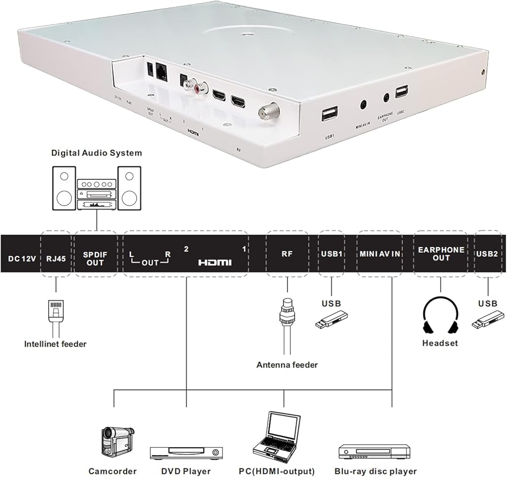 mini AV, CEC&ARC*2, Line (L/R) out, RF, Earphone, USB*2