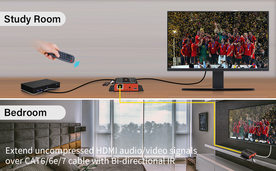 【HDMI Loop Out, IR Extension】This HDMI Extender Additional HDMI Output on the Transmitter to connect to a local display for monitoring of the extended display.Support remote control back to control the video source, You can control the HDMI source device at a remote location with the included IR cables that forward commands over a CAT cable.