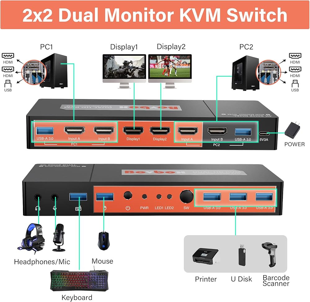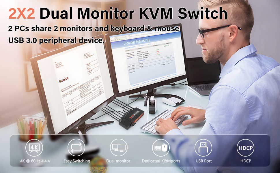 【Two Switching Methods with Wide Compatibility】Dual monitor KVM switches are available with multiple options1.Toggle selection on front panel; 2. Hotkey switch (keys on keyboard). zero latency keyboard and mouse switching makes your use smooth and enhance your work efficiency or gaming experience.Cross support multiple operation systems & devices: Fully com.patible Windows 10/7/2000/XP/ and Mac, also supports HDMI devices without USB signal input like DVR, NVR etc. Plug and Play.