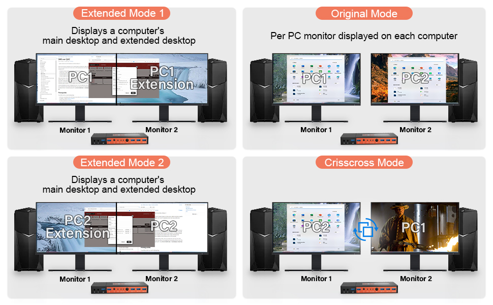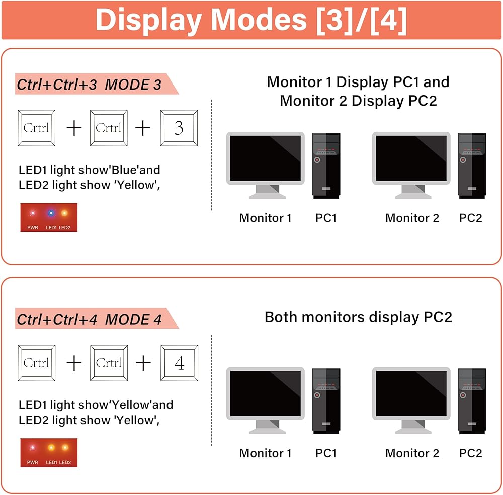 【KVM Switch 2 Monitors 2 Computers】 KVM Switch dual monitor, using only 1 set of keyboard, mouse and 2 monitors to control 2 computers for extended or respective display screens. Meet the needs of your different devices.The best KVM switch to keep your workspace tidy makes your life simpler and more efficient, and also a great home office setup.