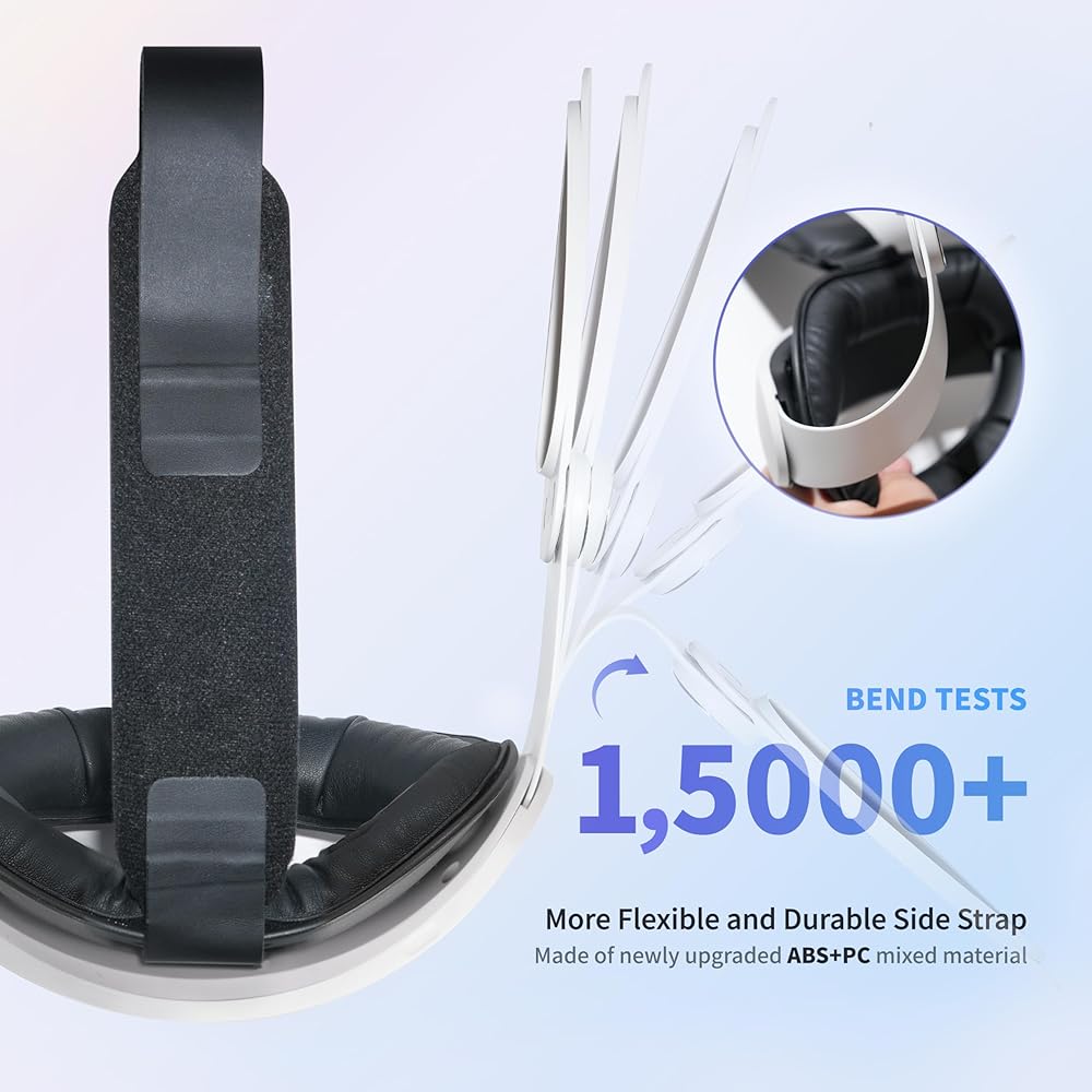 Robust side straps: Sits the quest 3 more firmly and securely to your face. Our Meta head strap made of upgraded polymer material, which is eco-friendly and incredibly strong. Withstand over 300,000 bends without breaking.