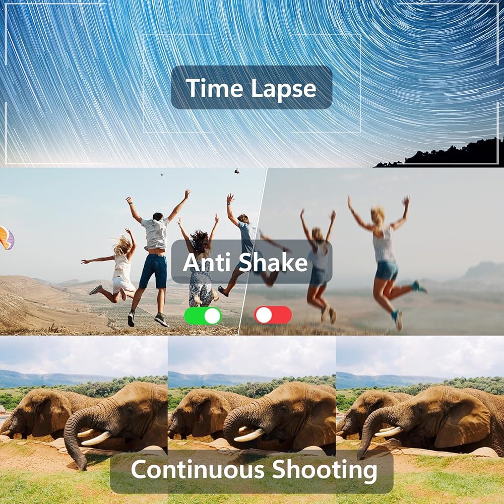 📸【Multifunction Video Camera & Anti-Shake】Capture the Perfect Shot. Use the Dial button at the top of the camera. From auto mode for quick and easy shooting to specialized modes like night scene and portrait, this camera offers a variety of shooting modes to suit any situation. With the high sensitivity mode, even low-light conditions won't stop you from capturing amazing photos. Supports Anti-shake.