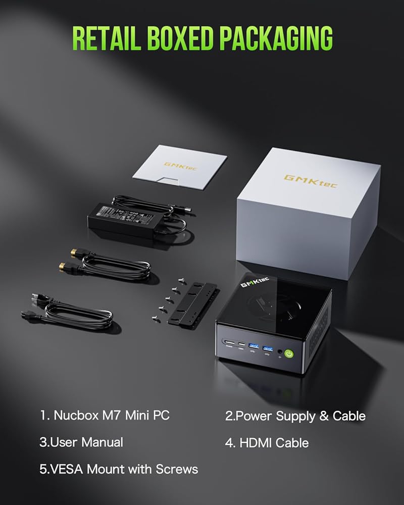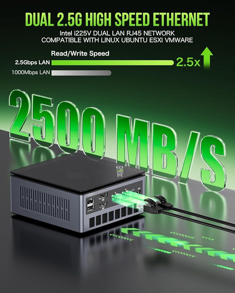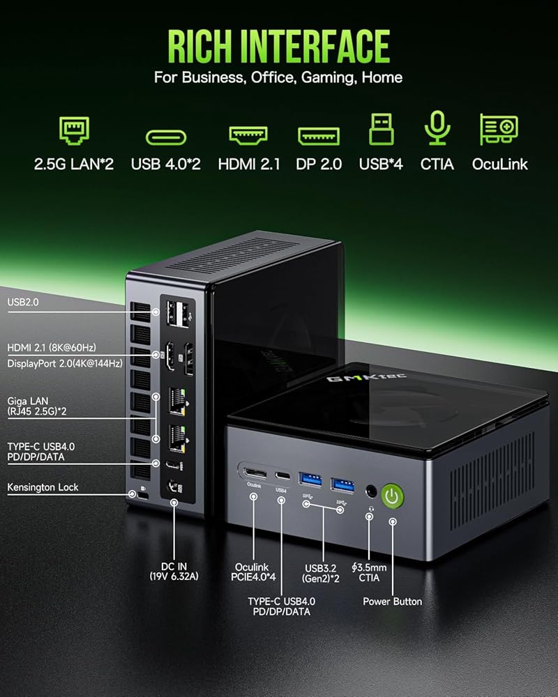 【Fast Internet & WiFi6 + BT5.2 Connection】GMKtec Mini PC has a 2.5Gbps Ethernet LAN (RJ-45, Network interface speed up to 2.5Gbps bandwidth rate), 2.4Gbps WiFi6(802.11ax, stronger capacity of resisting disturbance), and built-in Bluetooth 5.2, high-speed wireless connection. Interface features 3*USB3.2 ports(10Gbps), 1*USB2.0 ports, 2*HDMI 2.0 port(4K@60Hz), 1*USB-C port(USB4.0 40Gbps), and 1*Audio Jack (HP&MIC), 1*DC Power Port.