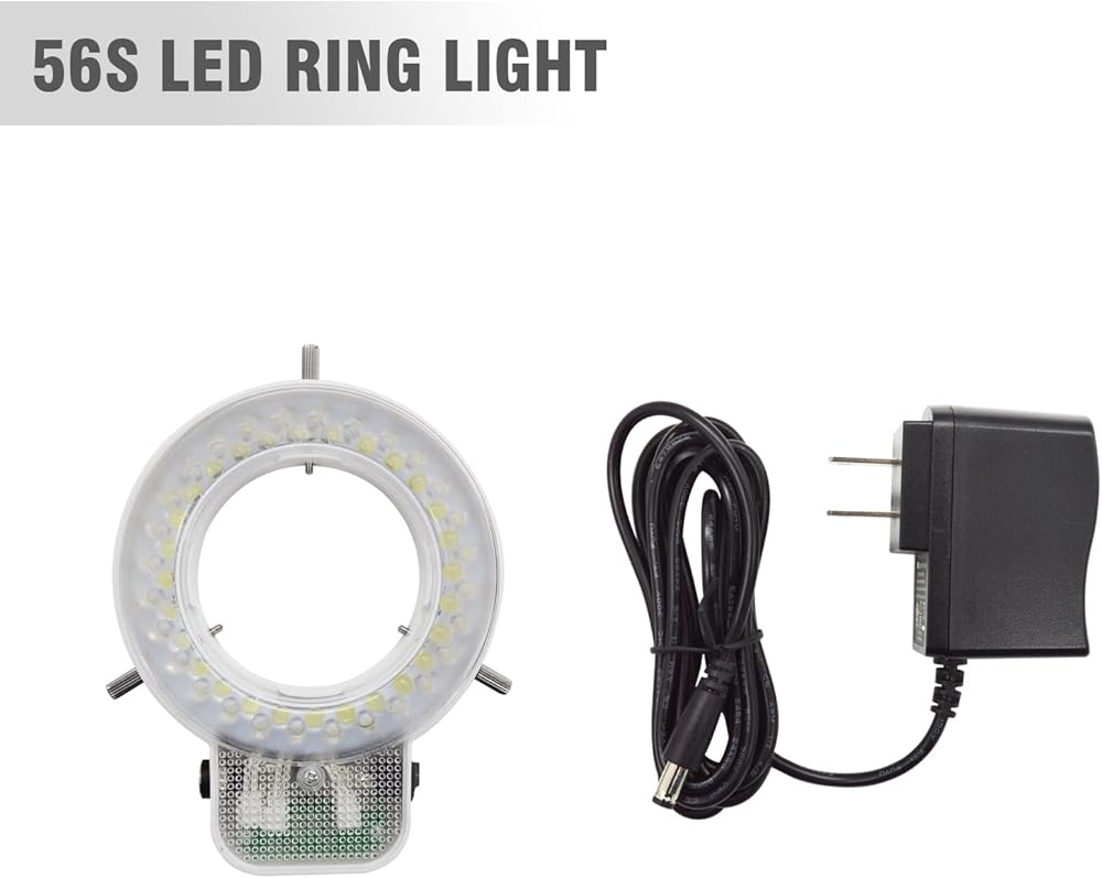 ADJUSTABLE ILLUMINATION: It comes a 56S LED ring light with this stereo microscope, it provides cool, strong focused shadow-free illumination, and it's equipped with a dimmer switch, you can easily adjust the brightness and turn it on and off.