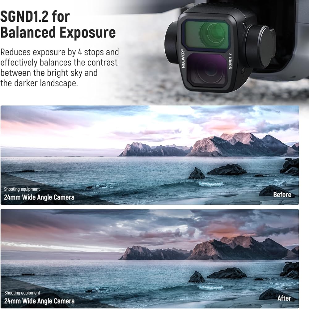 【Balanced Exposure for Landscapes】 The SGND1.2 (soft edge gradient Neutral Density) filter reduces exposure by 4 stops and effectively balances the contrast between the bright sky and the darker landscape. It is particularly useful in bright lighting conditions for capturing more balanced and natural looking images with enhanced details