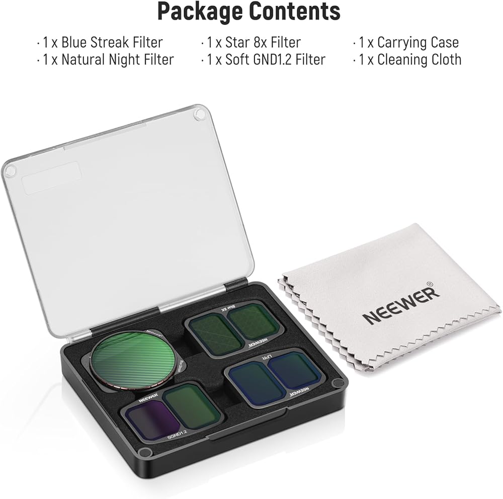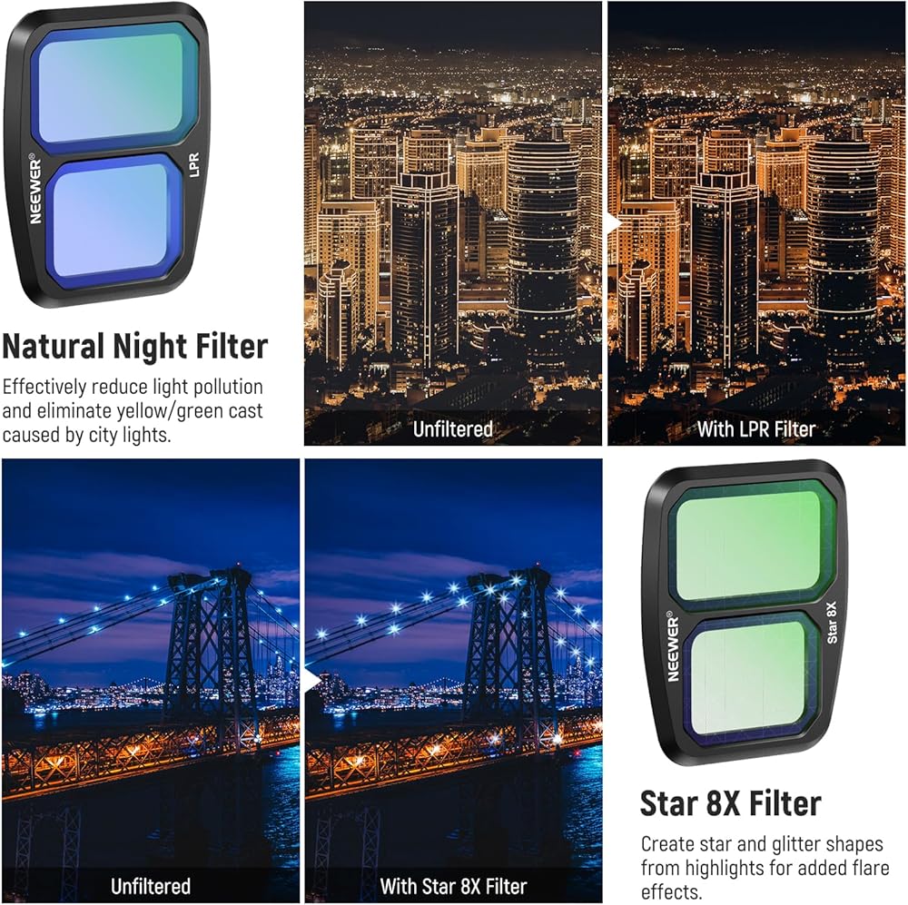 【Premium Natural Night Filter】 Use the light pollution reduction filter to effectively reduce light pollution and eliminate the yellow/green color cast caused by city lights. It helps capture clear details, maintain proper contrasts, and avoid overexposure in nighttime footage. Ideal for urban environments and low light shots