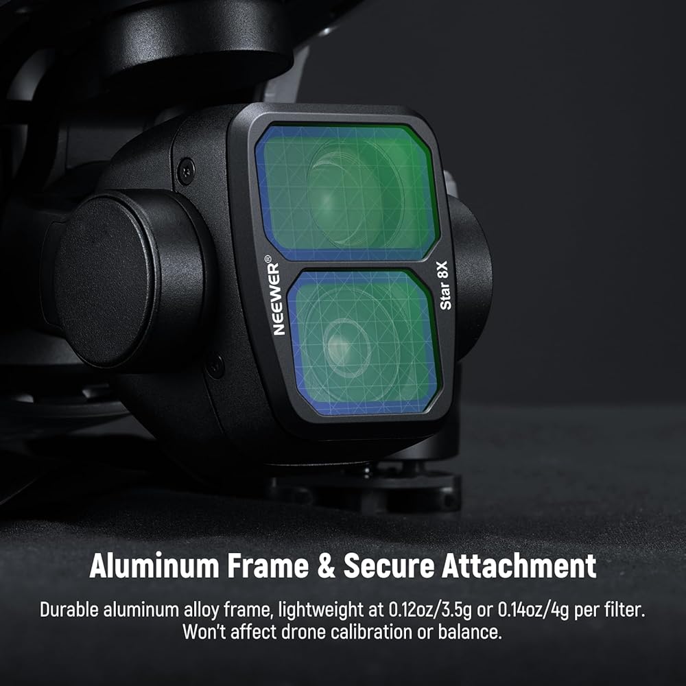 【Snap On Design & Secure Attachment】 The ultra slim and lightweight aluminum alloy frame has minimal impact on gimbal calibration (SGND1.2/blue streak/light pollution reduction: 0.12oz/3.5g, 8x star: 0.14oz/4g). The snap on mounting design guarantees a tight grip on the drone lens during flight. Easy installation and removal, plus a compact carrying case for effortless transport and storage