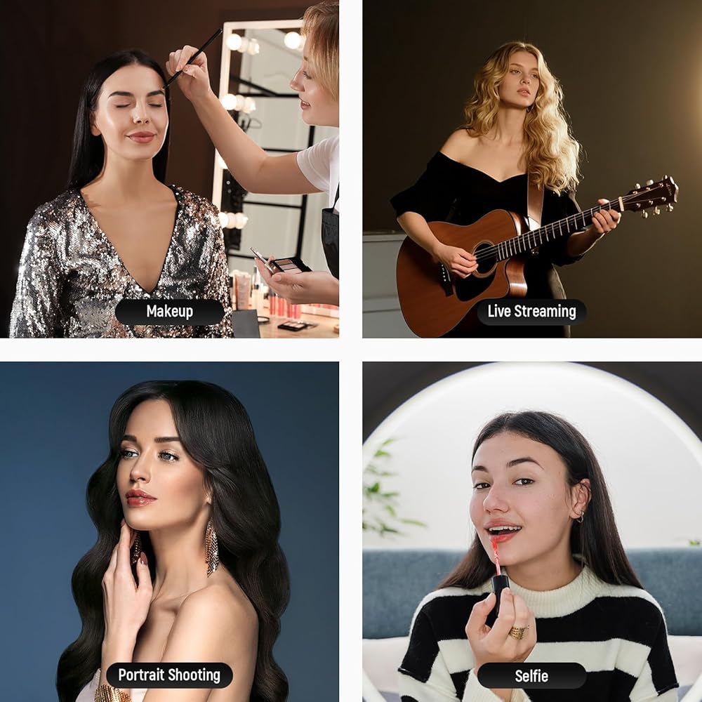 【Touch Screen and LCD Display】 The ring light features a touch screen panel and LCD display for easy brightness and color temperature adjustments, with a simple long press of the power key to turn it on. The built in LCD conveniently displays luminance and color temperature indices for efficient operation