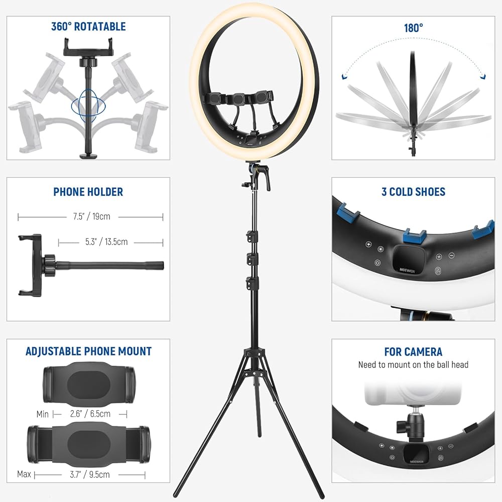 【Package Contents】1 x 19 inches LED Ring Light, 1 x Ring Light Tripod Stand, 3 x Adjustable Phone Holder, 1 x Remote Control, 1 x Selfie Shutter, 1 x Power Cord, 1 x Carry Bag, 1 x User Manual.