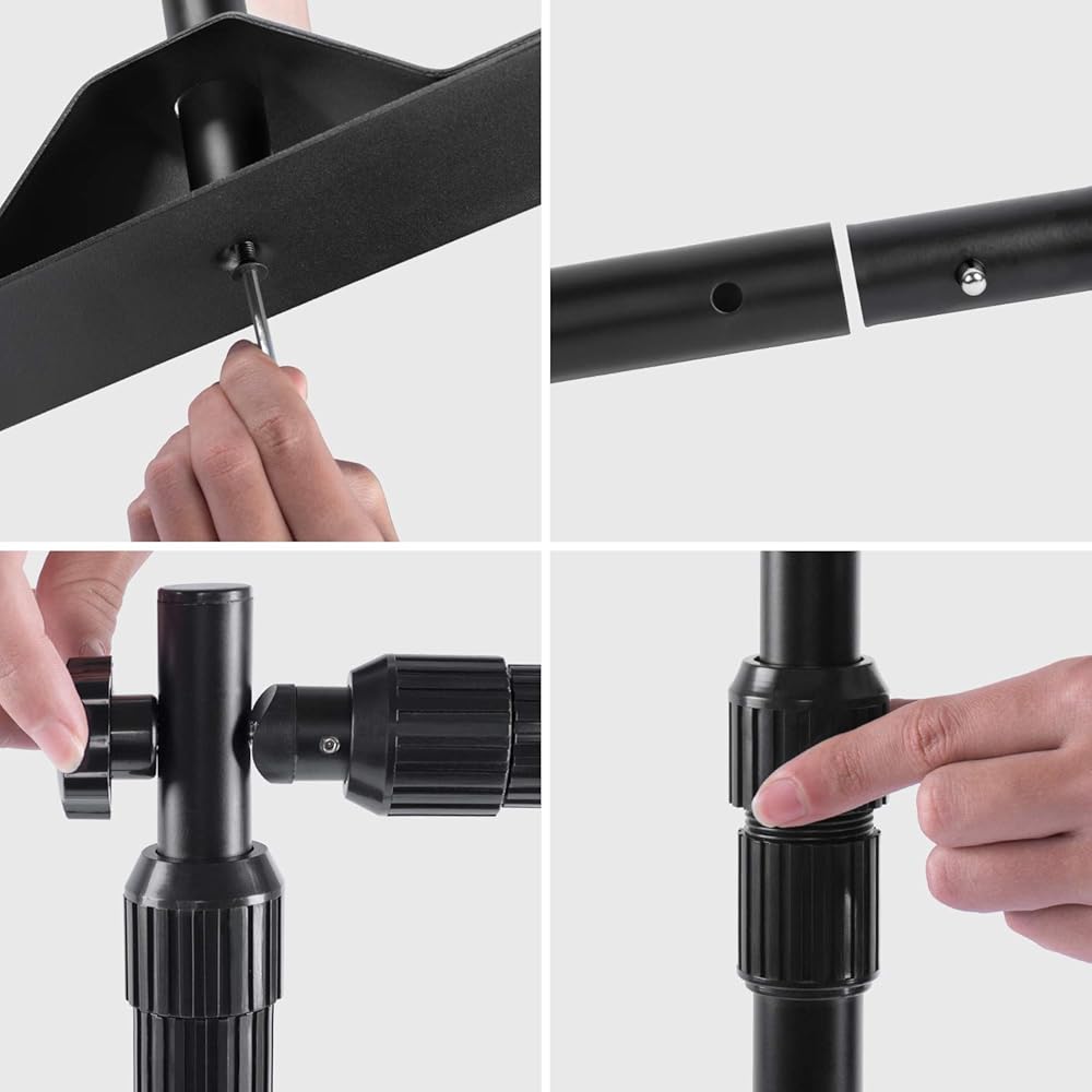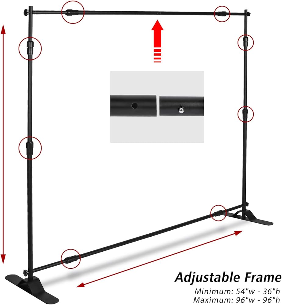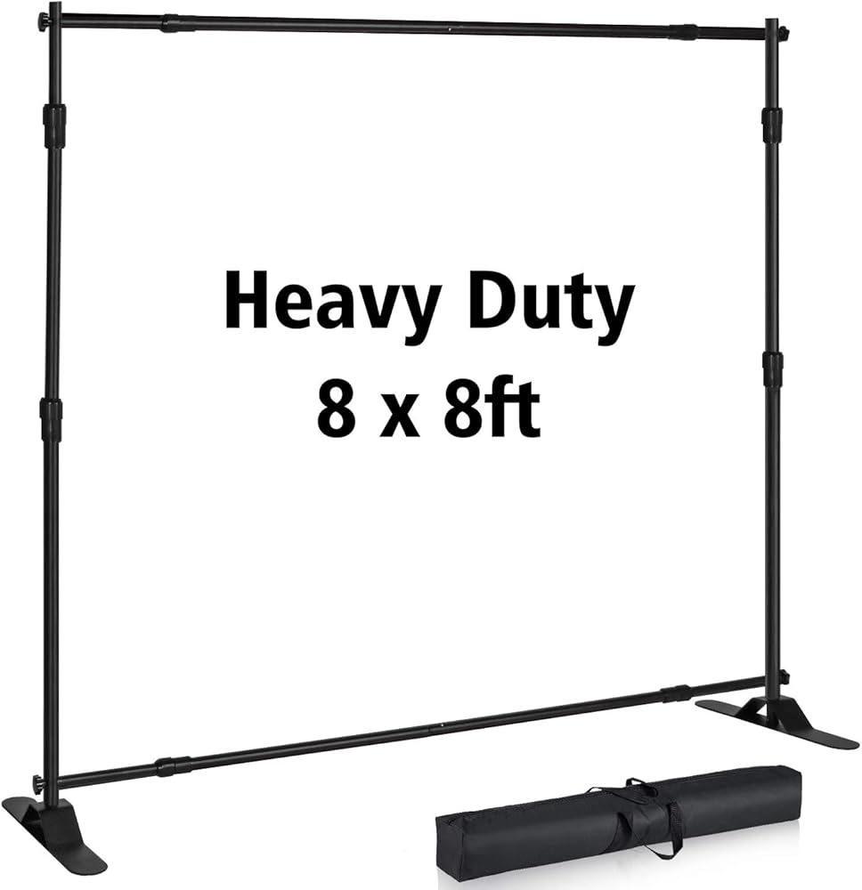 T-SIGN 5' x 7' - 8' x 10' Extra Thick Heavy Duty Backdrop Banner Stand T-SIGN Backdrop Banner Stands are a perfect display solution when you need a stand to hold a large size banner or when you really need a professional presentation to show off your company at any venue, media event, tradeshow or for photobooth backgrounds as a step and repeat. Our telescopic backdrop stand heavy duty is durable, adjustable, and most importantly, massive! The heavy duty backdrop stand is durable, easy to transport with a soft carrying bag which makes it a portable backdrop. Perfect as a photo booth stand! We use strong aluminum material to protect against the wind. The backdrop frame will work great at your next tradeshow as a banner stand for display! Specification: Width range: 80"- 139" Height range: 44"- 102" Maximum visible graphic size: 139"x102" Diameter of the thickest place: 5mmColor: Black Package:1x Banner backdrop stand1x Free carrying bag1x Hex keyAll installation hardware (Attention: Banner is not included) Customer Service Please read the product instructions carefully, in the event of difficulties, do not hesitate to contact us. Our Goal is to Serve You until Get Your Satisfaction About T-SIGN T-SIGN is a professional manufacturer of high-quality sign stand, We have twenty years of experience in this industry, produced hundreds of thousands of stand products every month, from poster stands, banner stands, magazine stands, backdrop stands and X display, etc. Each of our products is carefully manufactured and rigorously tested before selling. T-SIGN wants to keep bringing best quality stands to customers all over the world! Not just talking about it, we'll stick to it!