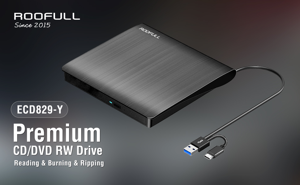 ROOFULL External CD DVD Drive Player, USB 3.0 USB-C Portable CD DVD +/-RW Disk Drive Burner CD-ROM Reader Writer for Laptop Desktop PC, Windows 11/10/8/7, Apple Mac MacBook, Linux OS