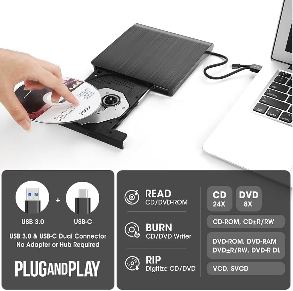 【Plug & Play CD/DVD Player for PC】No extra driver program is required, as easy as using an internal optical disc drive. Just plug this external CD/DVD RW drive into your laptop or desktop PC, and insert your CDs or DVDs, it will be recognized automatically, then you can use a media player, burning, or ripping software to read, write, and rip your CDs and DVDs. Easy to use!