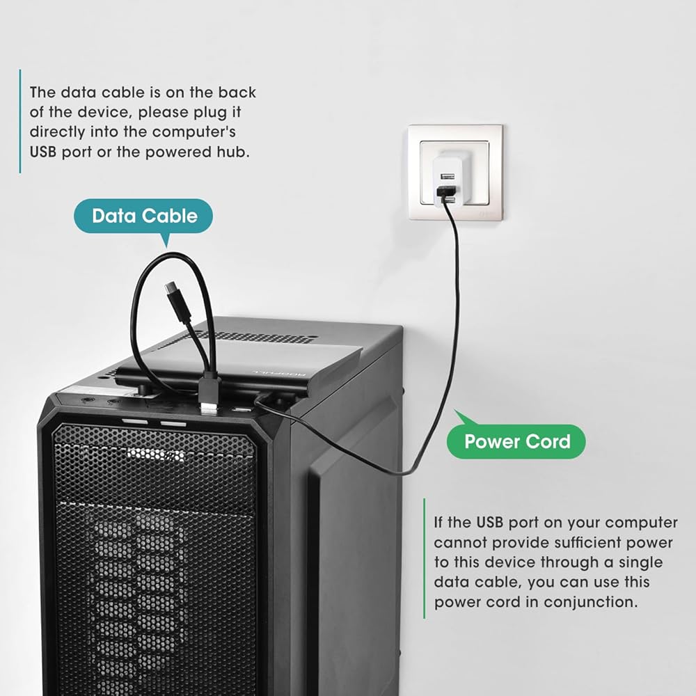 【No Power Shortage Issues Anymore】In addition to the embedded USB 3.0/USB-C data cable, we also prepared an additional USB-to-micro USB power cable, in case the USB port on your computer (such as Surface Pro) cannot supply enough power for this device through a single data cable, you can plug the power supply cord together. If there is no power shortage problem, you can remove this power cord. (Tips: The power cord cannot transmit data, please do not use it alone)