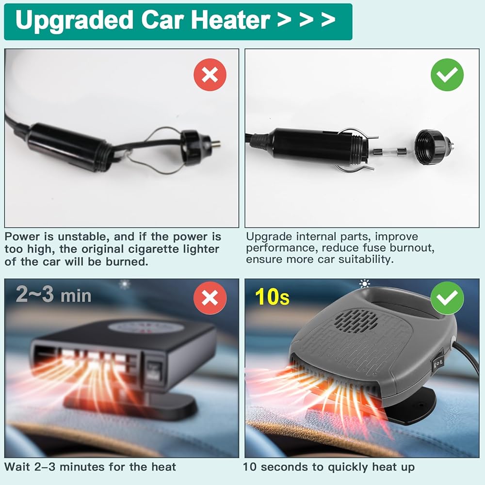 FILBA portable car heater is upgraded in quality and a built-in fuse in the cigarette lighter plug, which automatically cuts off the power when there is a safety hazard, making it safer and more worry-free.