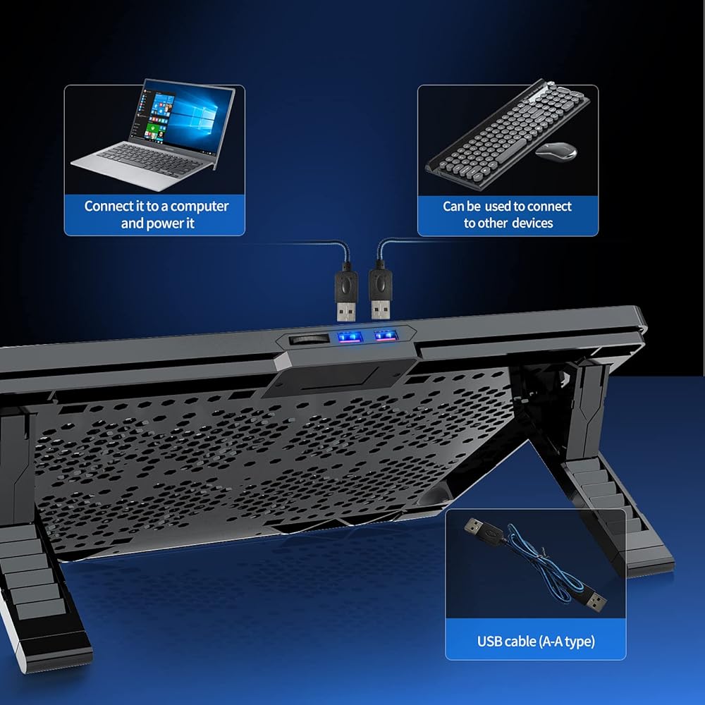 【Unique USB Port Design】Laptop cooler fan with built-in two USB ports, one for connecting laptop USB ports , one for connecting more USB devices. Such as a mouse, keyboard, just plug and play, easy to use.