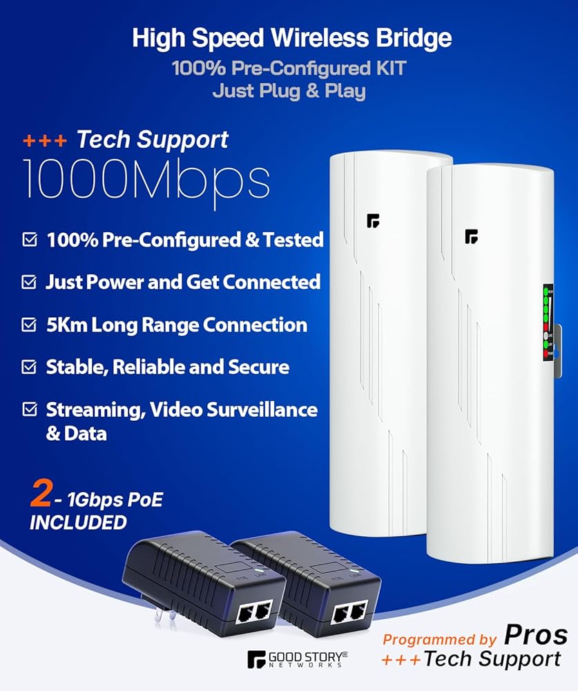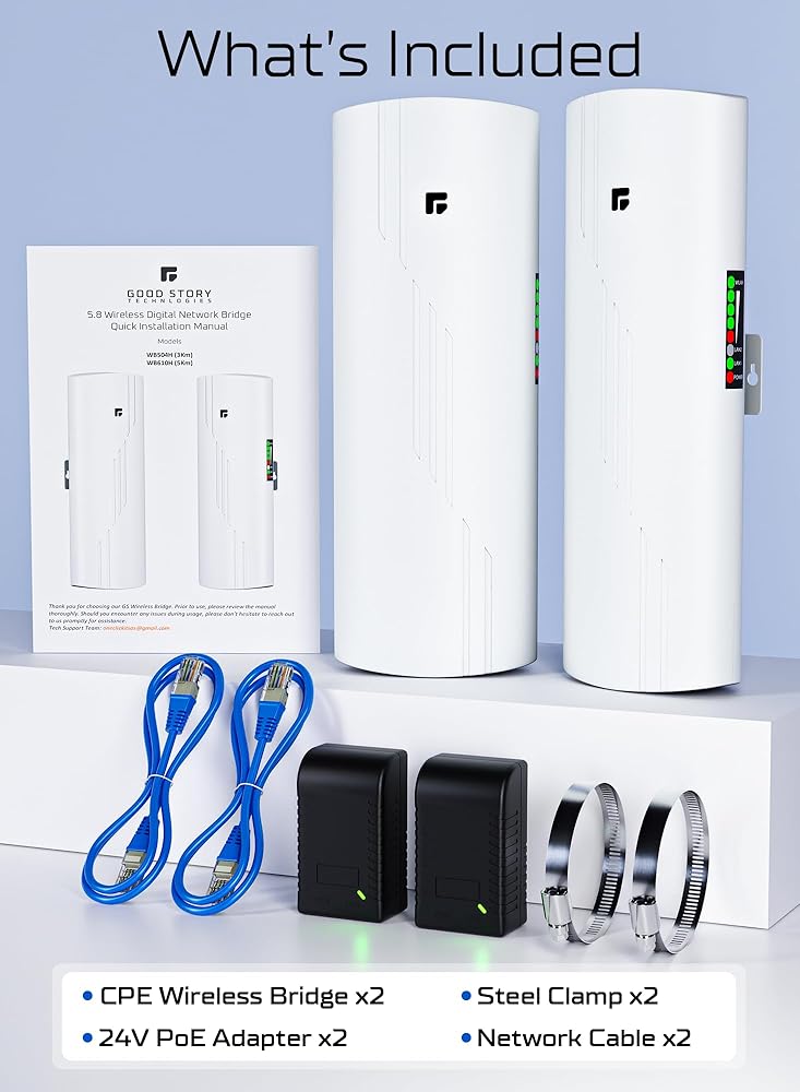 Wireless Bridge Point to Point Outdoor WiFi, Wireless Network Expansion Kit, Long Range High Speed 5G | 2 Units Bridge Kit Complete Pre-Configured - P2P 1000Mbps 5Km(2Pack)