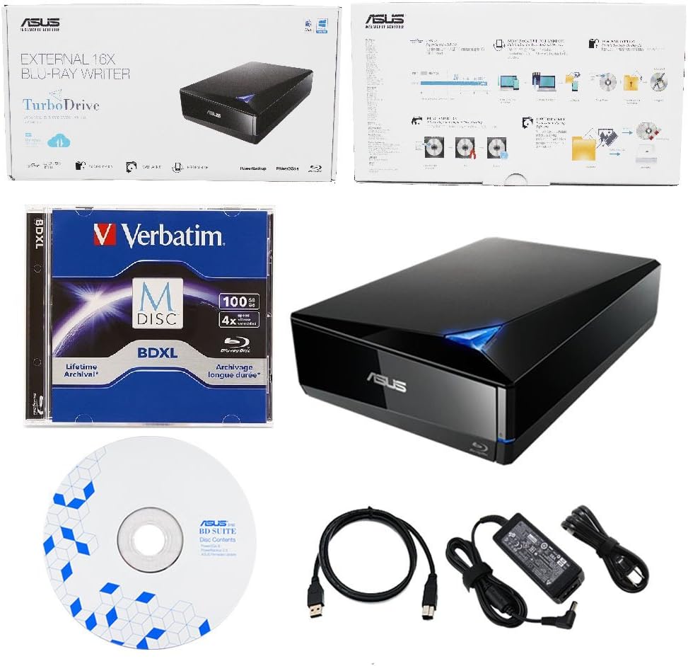Produplicator Asus 16x External Blu-ray Drive with BD Suite Disc, USB 3.0 Cable, Power Adapter and Cord (BW-16D1X-U) Bundle with 100GB Verbatim M-DISC BDXL