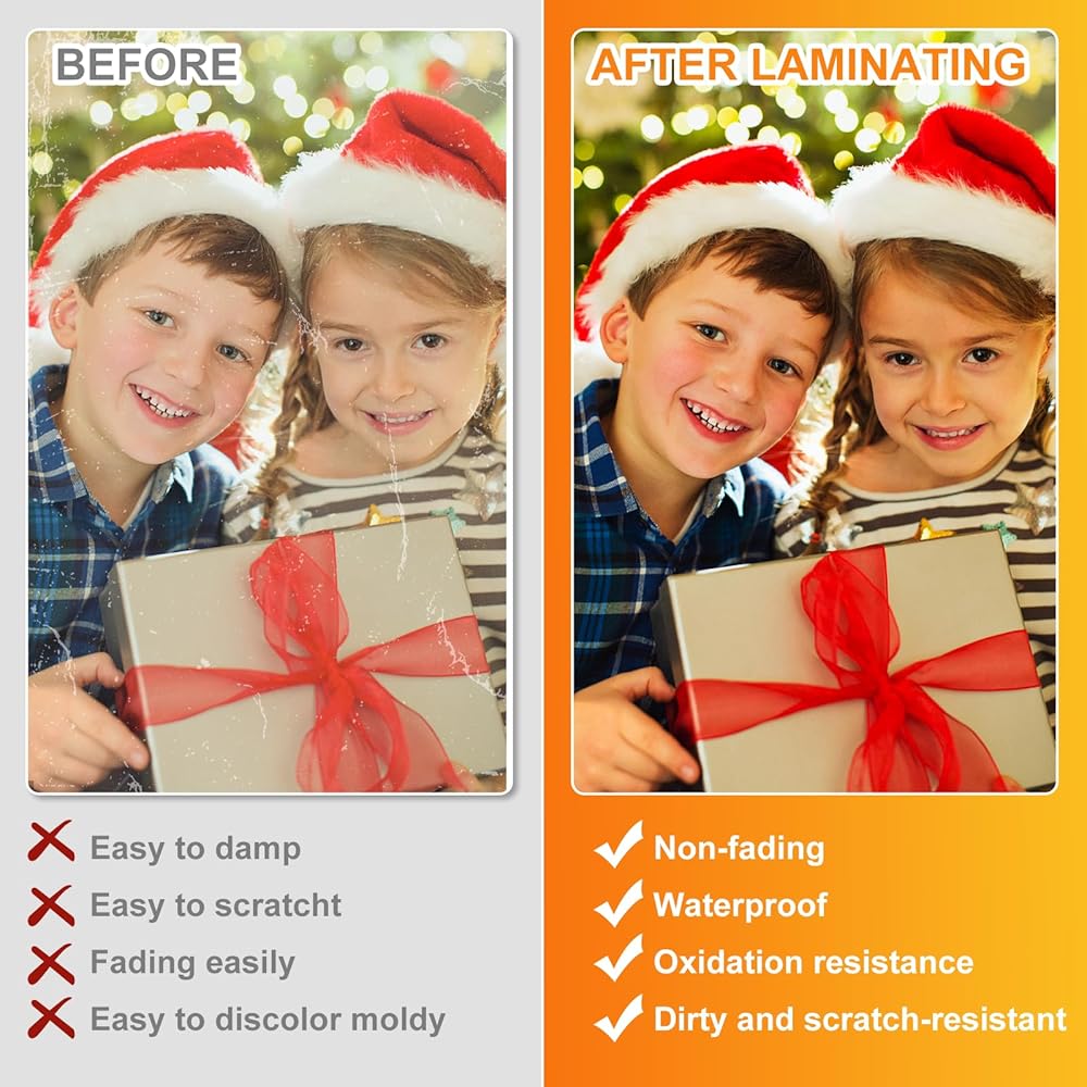 Excellent Clarity:The laminating sheets only use high-quality adhesive for best transparency to ensure that the photos and documents are clearly visible let important information show through! Round corner design, safe to use