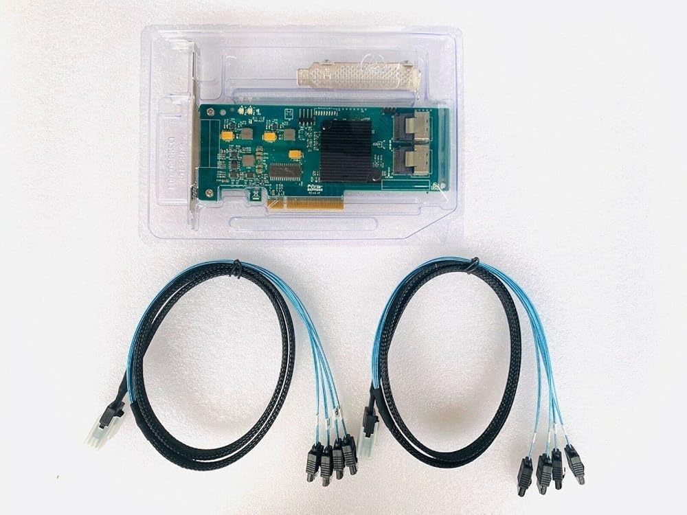 Package content: 1x controller card, 1x high support bracket, 1x low support bracket, 2x SFF-8087 SAS SATA