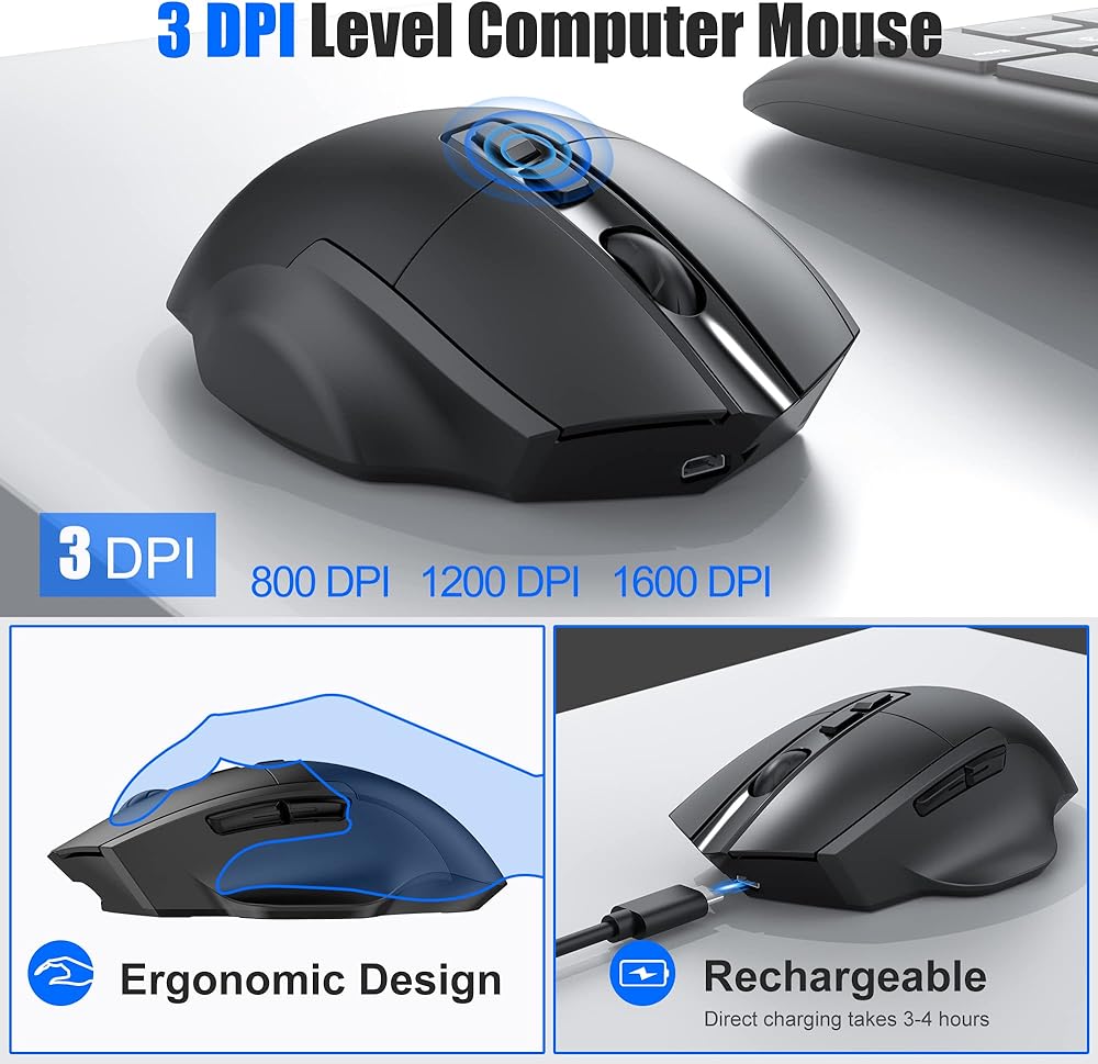 【Rechargeable and Energy Saving】: Wireless keyboard and mouse combo built-in rechargeable 1000/500mAh lithium battery, this keyboard and mouse combo can be easily charged with included type-c charging cable . Standby time is 1200 hours and continuous work is 250 hours.. It is not used for more than 30minutes, will automatically go into sleep mode to save energy and press any key to wake it up.