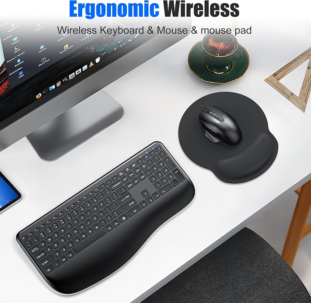 【Ergonomic Wireless Keyboard and Mouse with Mouse Pad Combo】:Full-size wireless keyboard designed ergonomically with wrist rest and folding stand to keep it at an optimal slope to prevent your wrists from hurting during long typing sessions. Wireless mouse with the latest ergonomic design, the perfectly matches the position of each of your fingers.Comfortable computer mouse pad for laptop, pain relief mousepad with non-slip PU base for office & home.